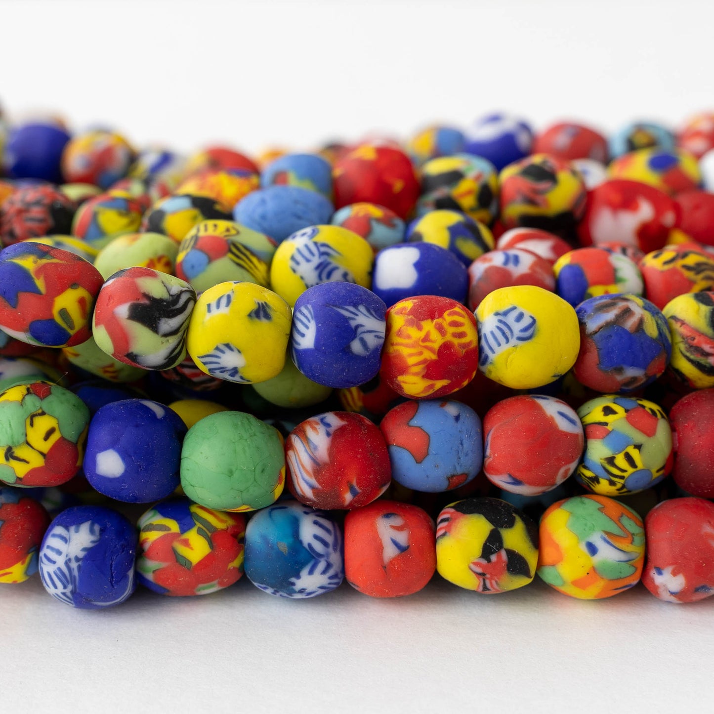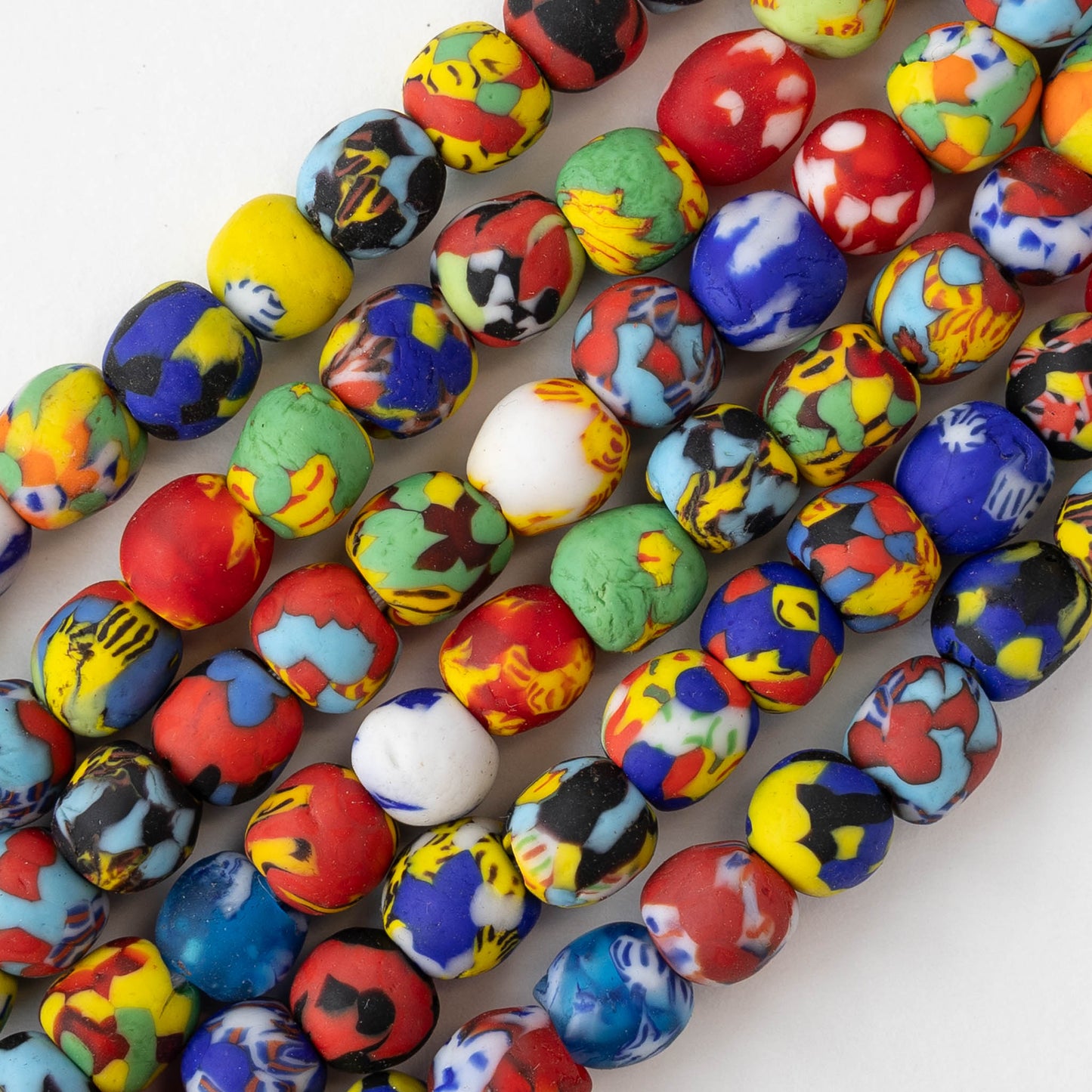 A colorful selection of Beads made for the African market. Some of these are made in Ghana or other regions of The large continent of Africa. There are many beads made in Venice Italy, Indonesia and France. This partnership dates back many years.