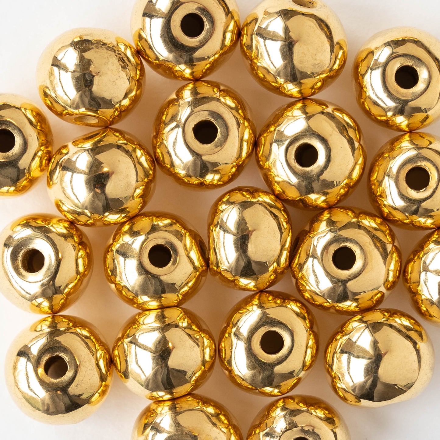 These shiny 24K beads start as kiln-fired terracotta "biscuits." They are then fired a second time with rough copper, and finished with a coating of Pure 24K gold. These are hand formed and therefor not always perfectly round.