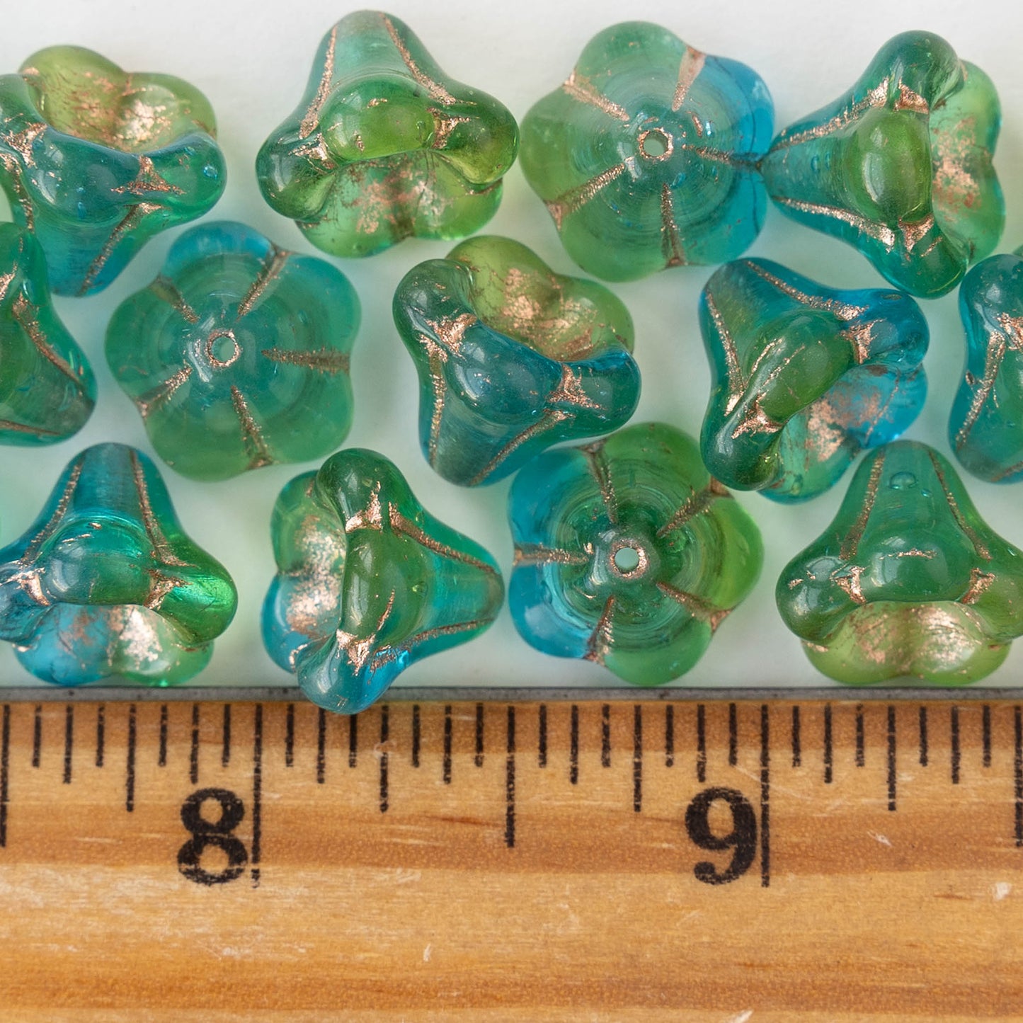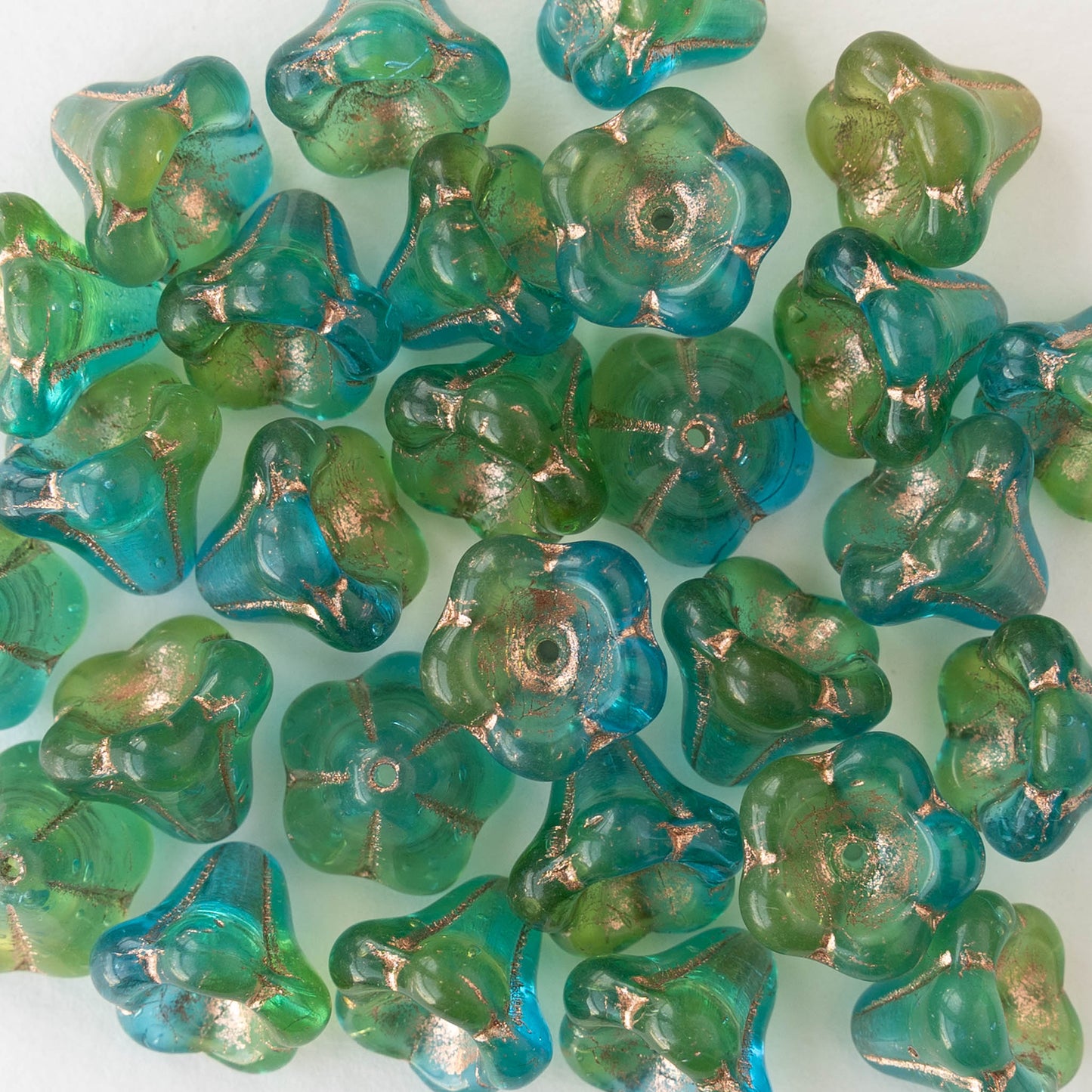 11x13mm Glass Flower Beads - Teal and Green with Gold Wash - 10 or 20 beads