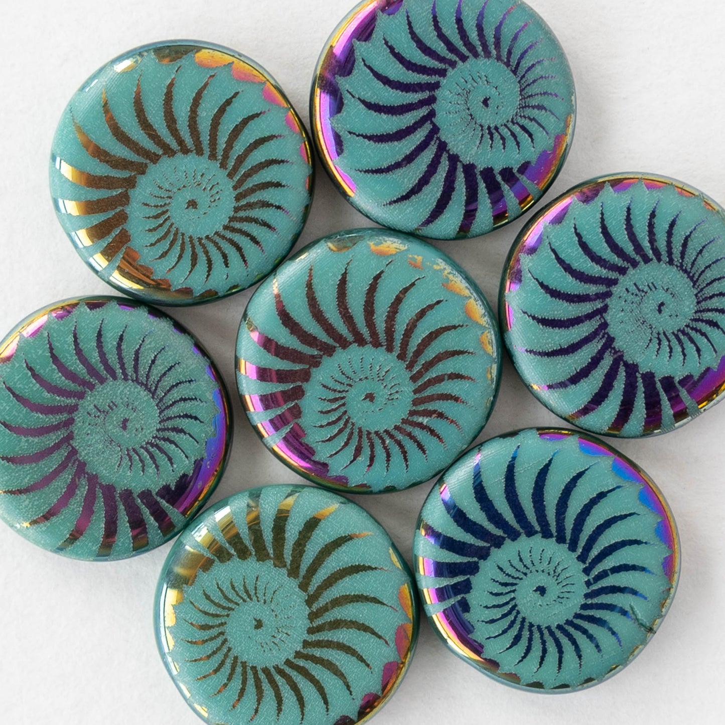 14mm Coin Beads - Turquoise Iris Spiral - 8 beads