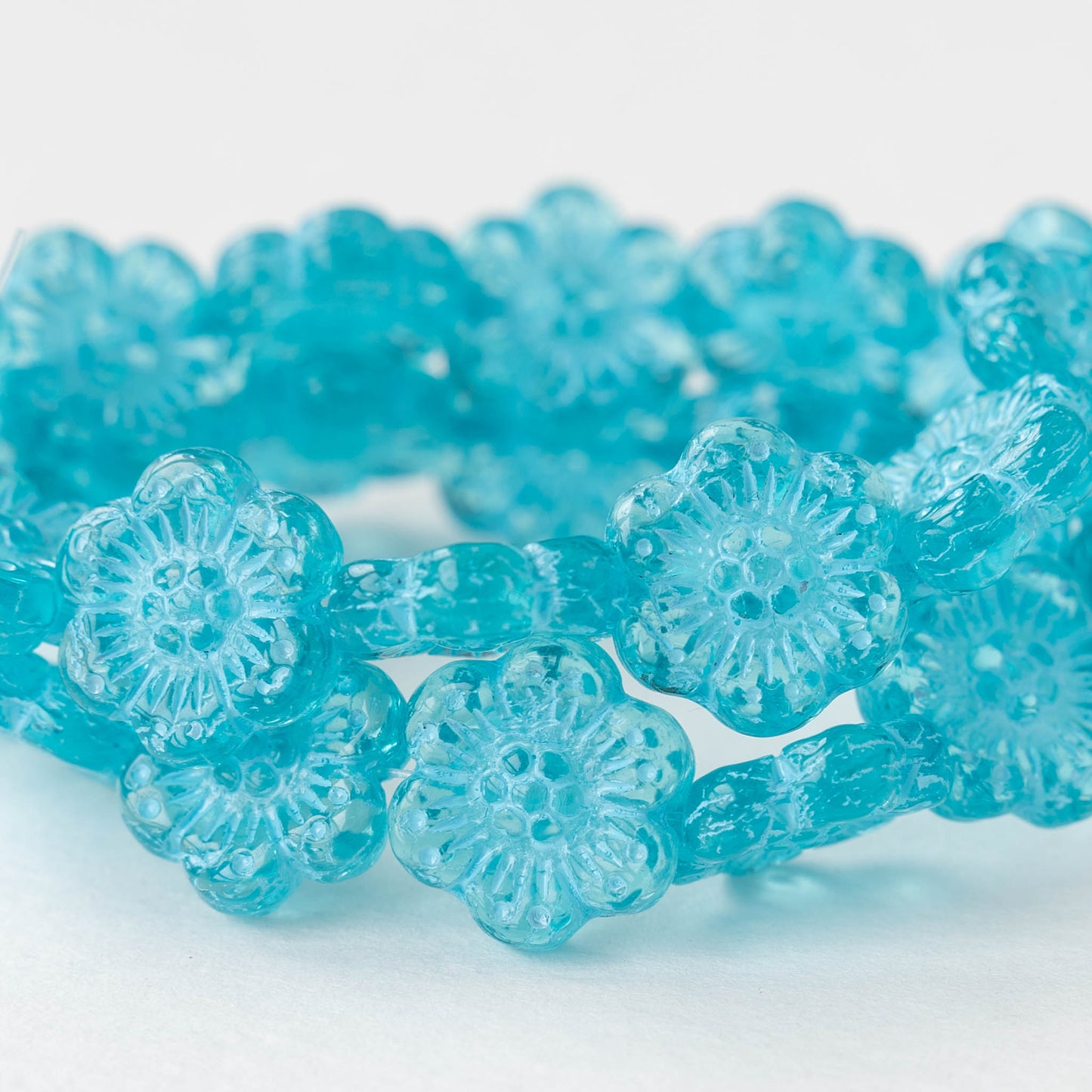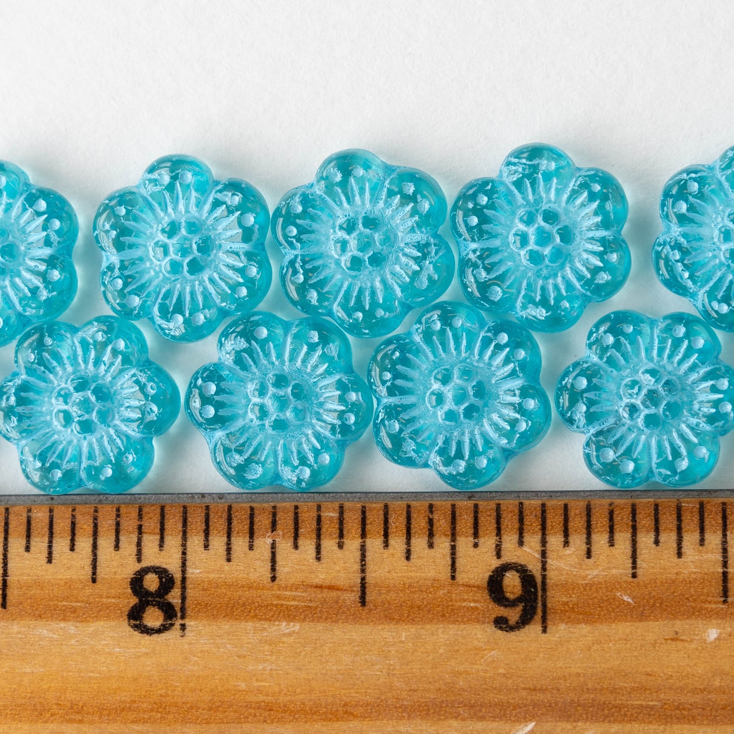 14mm Glass Flower Beads - Transparent Aqua with Light Blue Wash -12 Beads