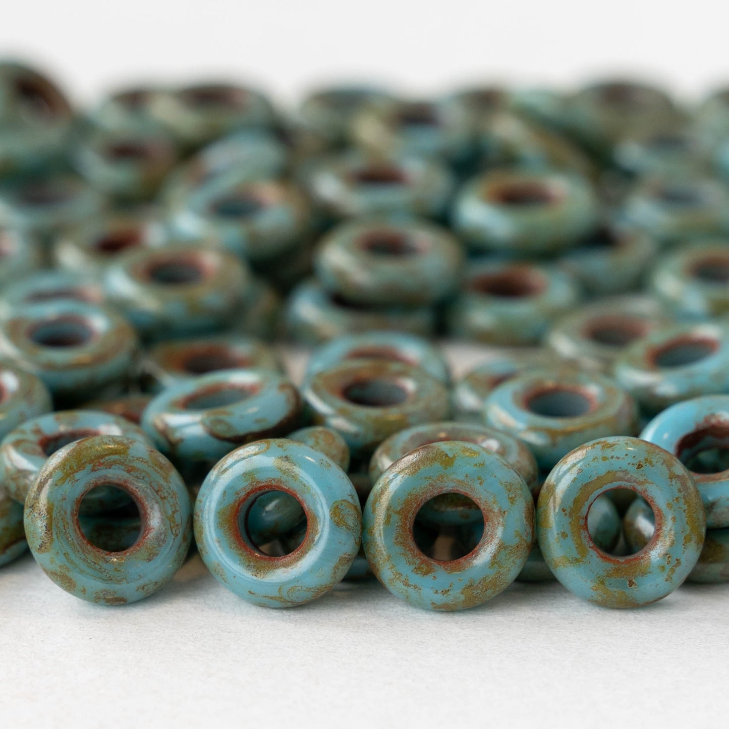 All available inventory for 10mm Glass Ring Beads - Opaque Turquoise Travertine - 20 Beads has been added to the cart.