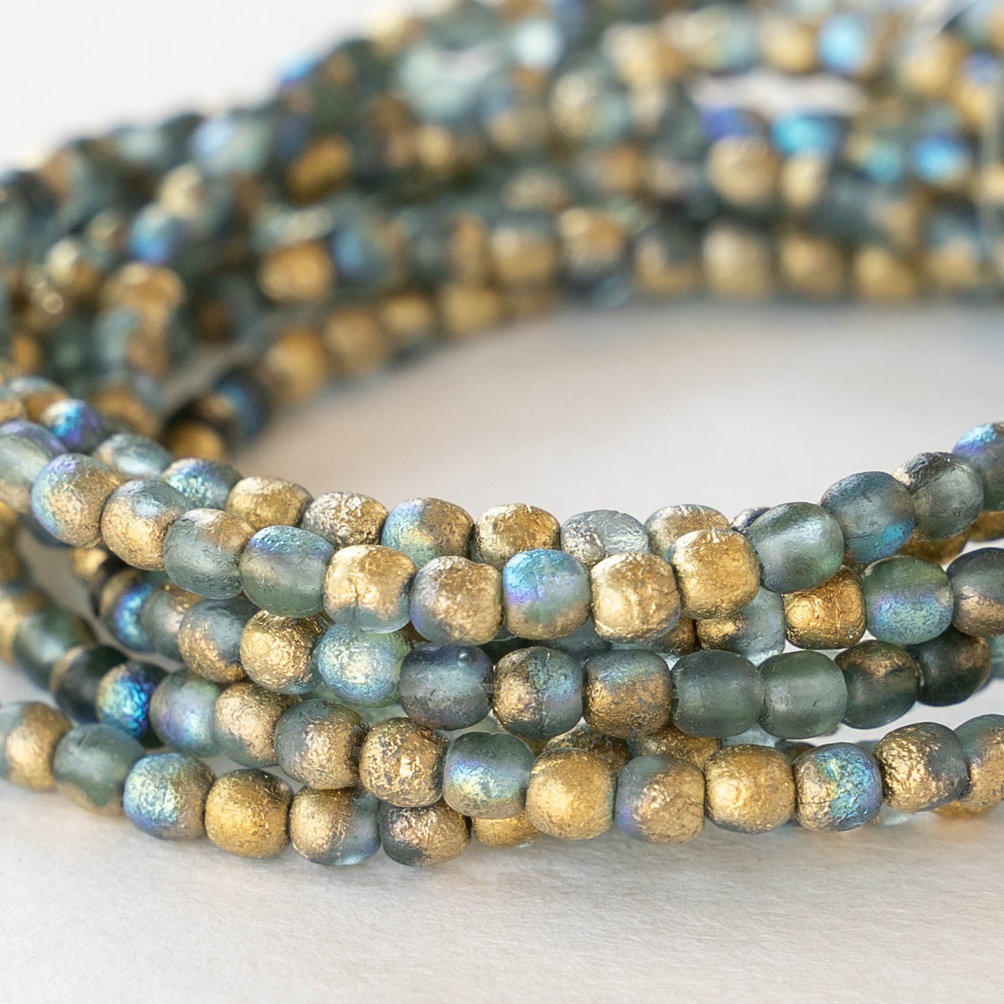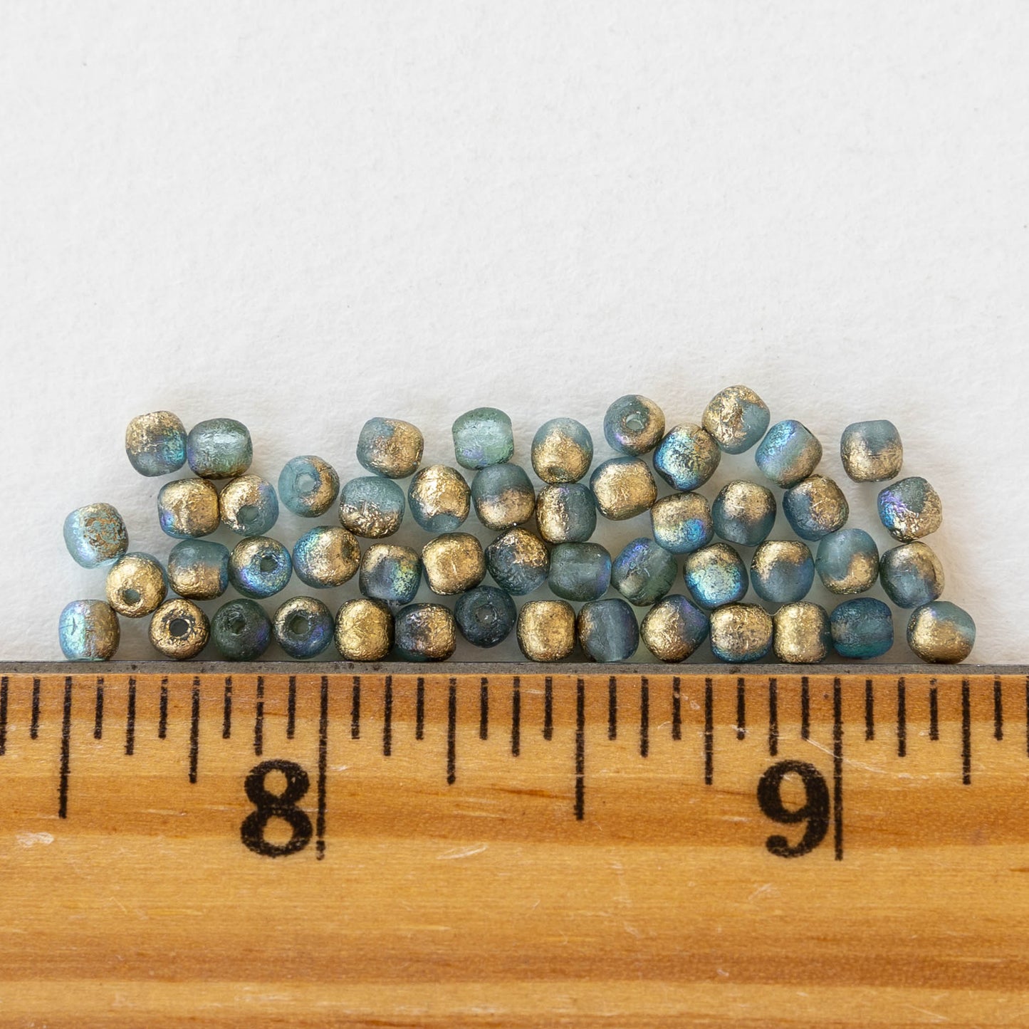 3mm Round Glass Beads - Etched Aqua Blue with AB and Gold - 50 Beads