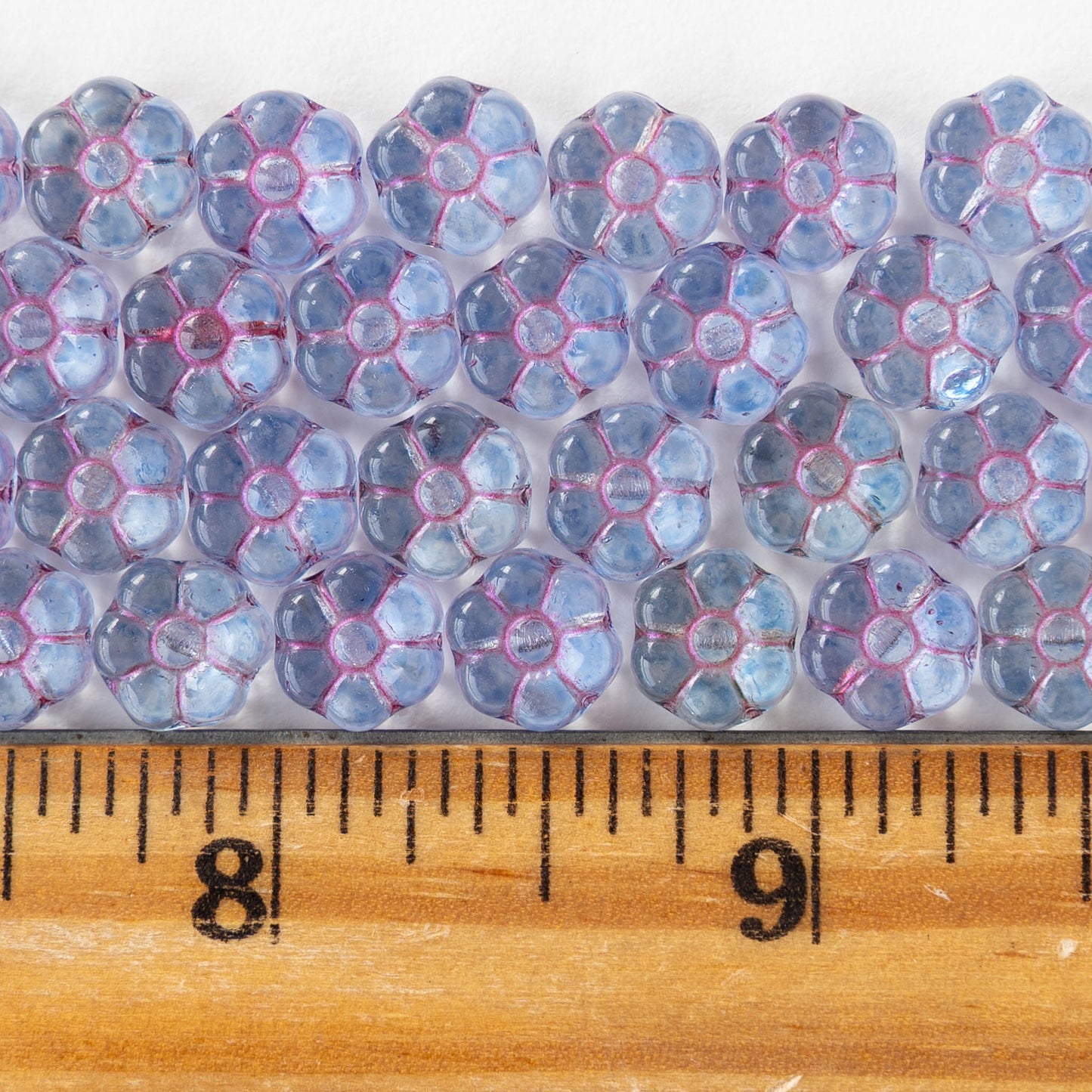 8mm Glass Flower Beads - Transparent Light Blue with Pink Wash - 20 beads