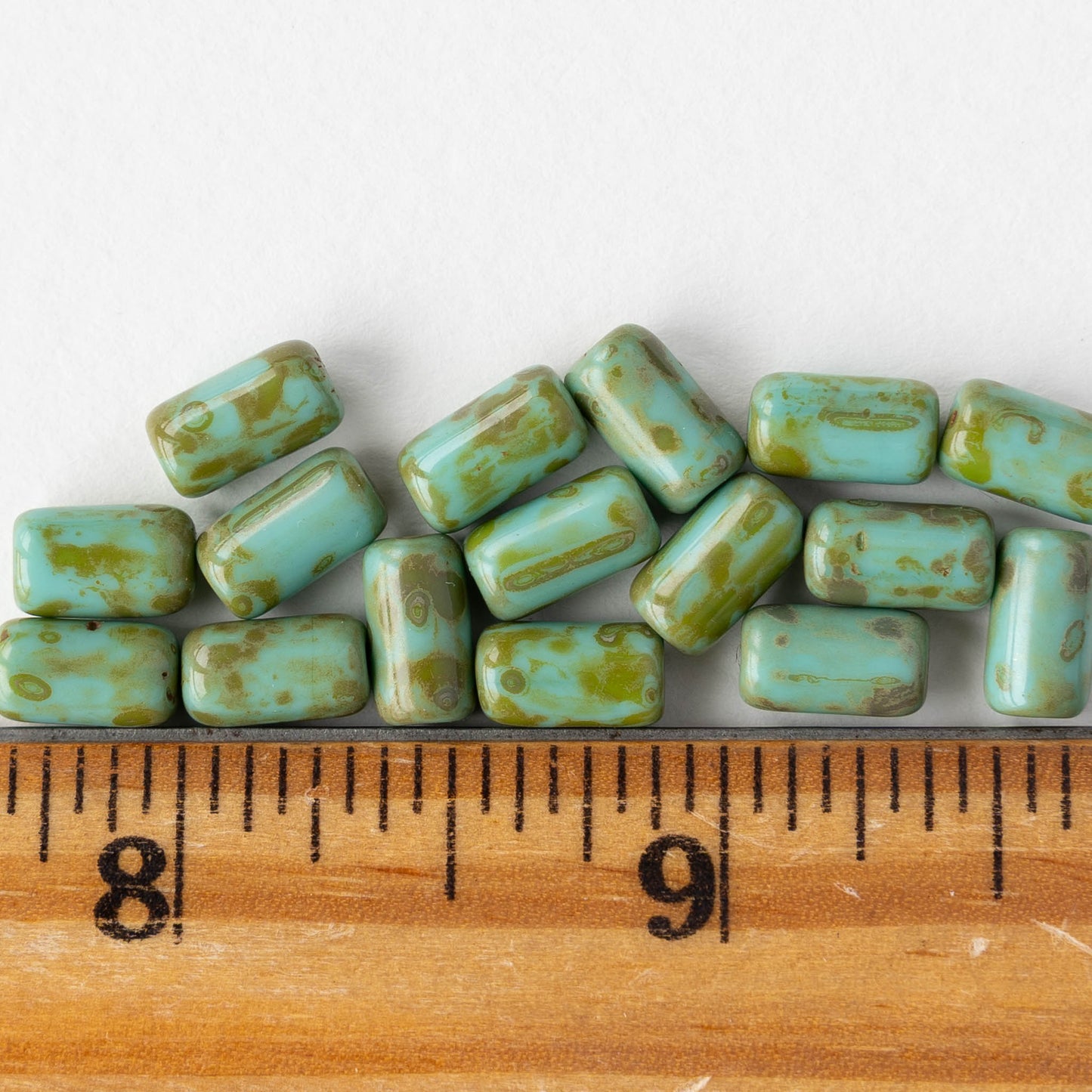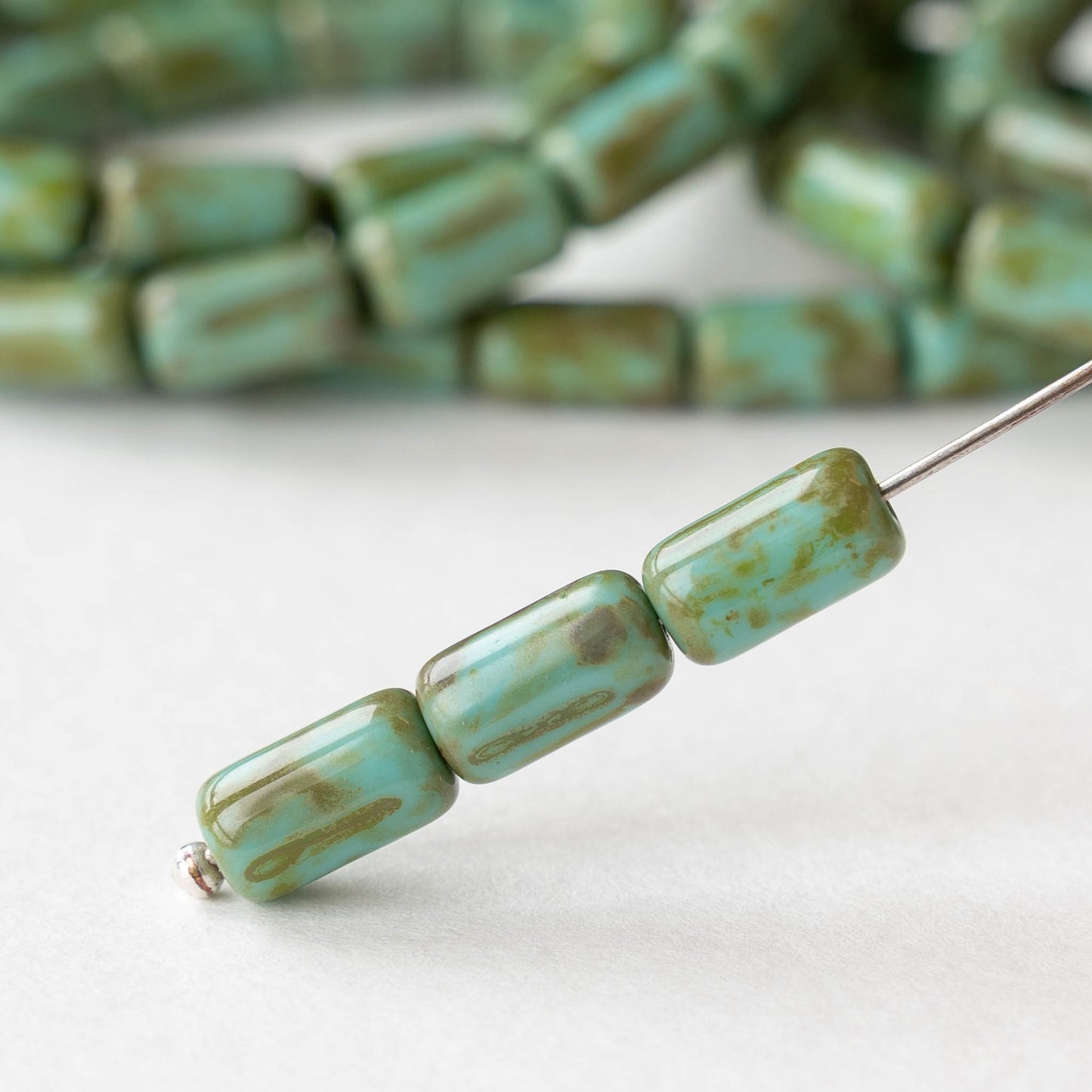 All available inventory for 9x5mm Glass Tube Beads - Turquoise Picasso - 16 beads has been added to the cart.