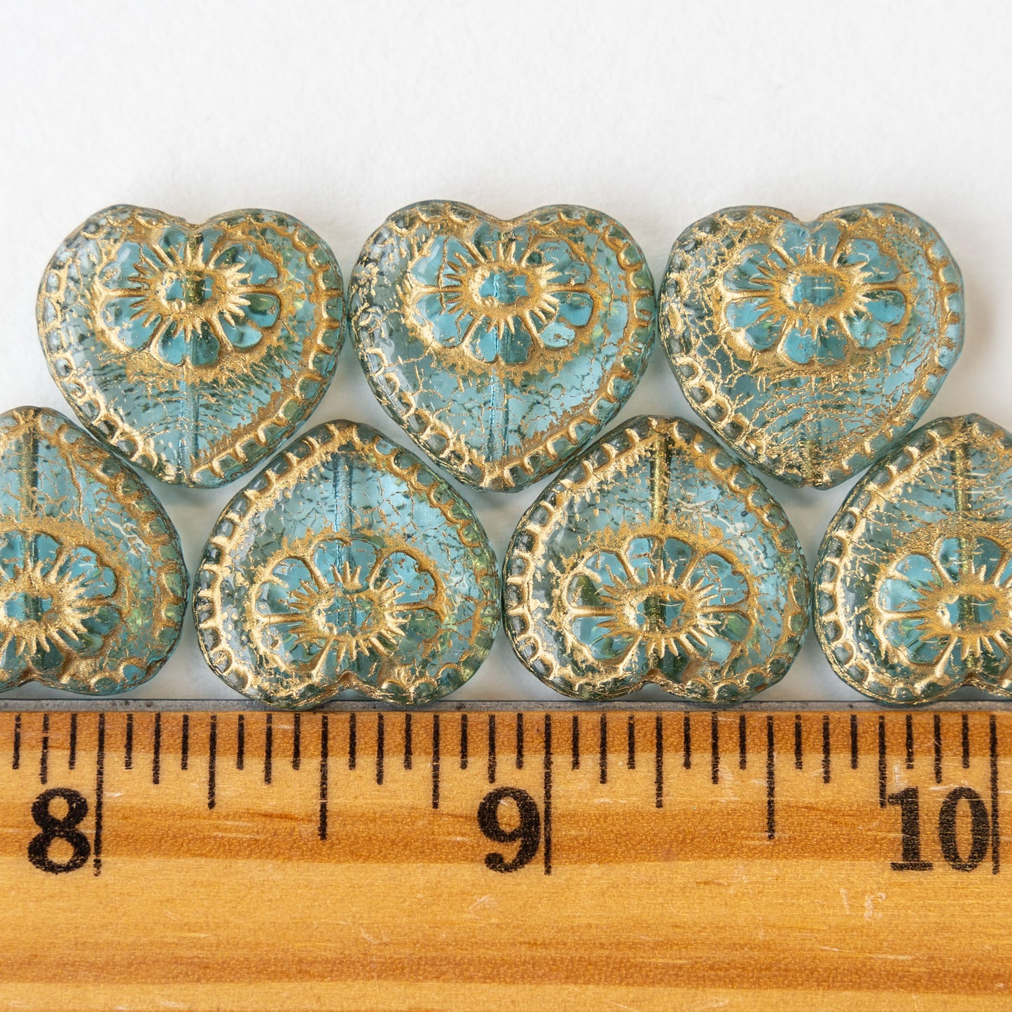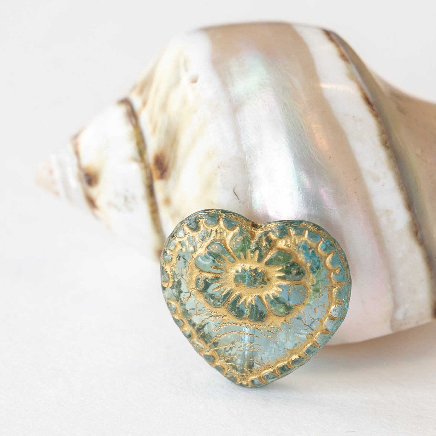 17mm Victorian Glass Heart Beads - Aqua with Gold Wash - 4 or 12