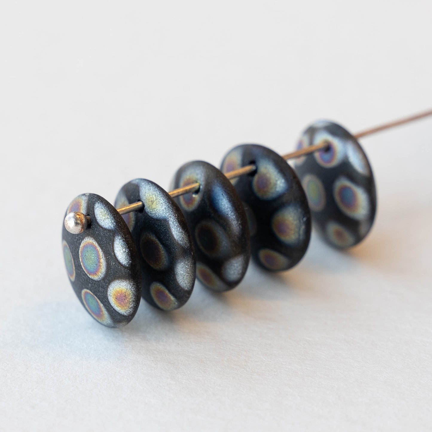 Lentil drop beads with a cool peacock finish.