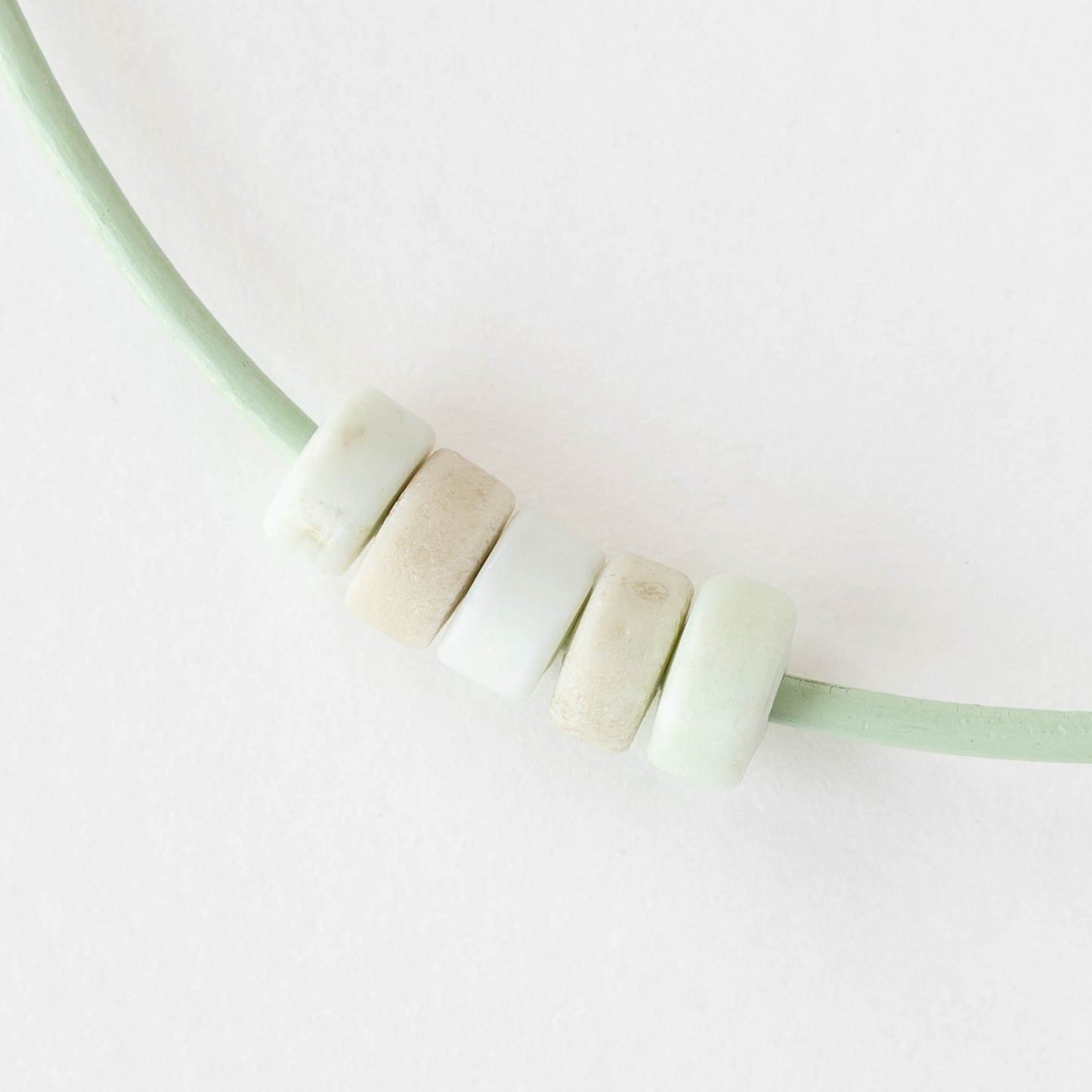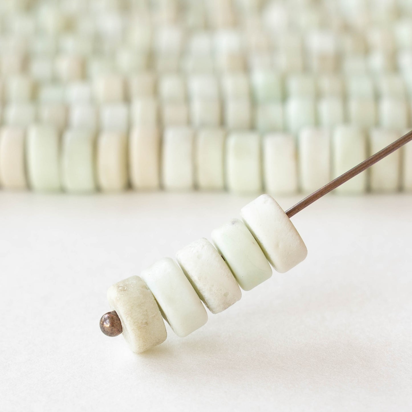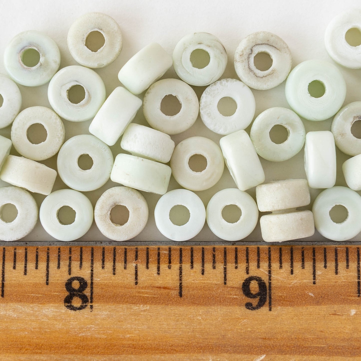 Irregular glass disk beads from Indonesia.