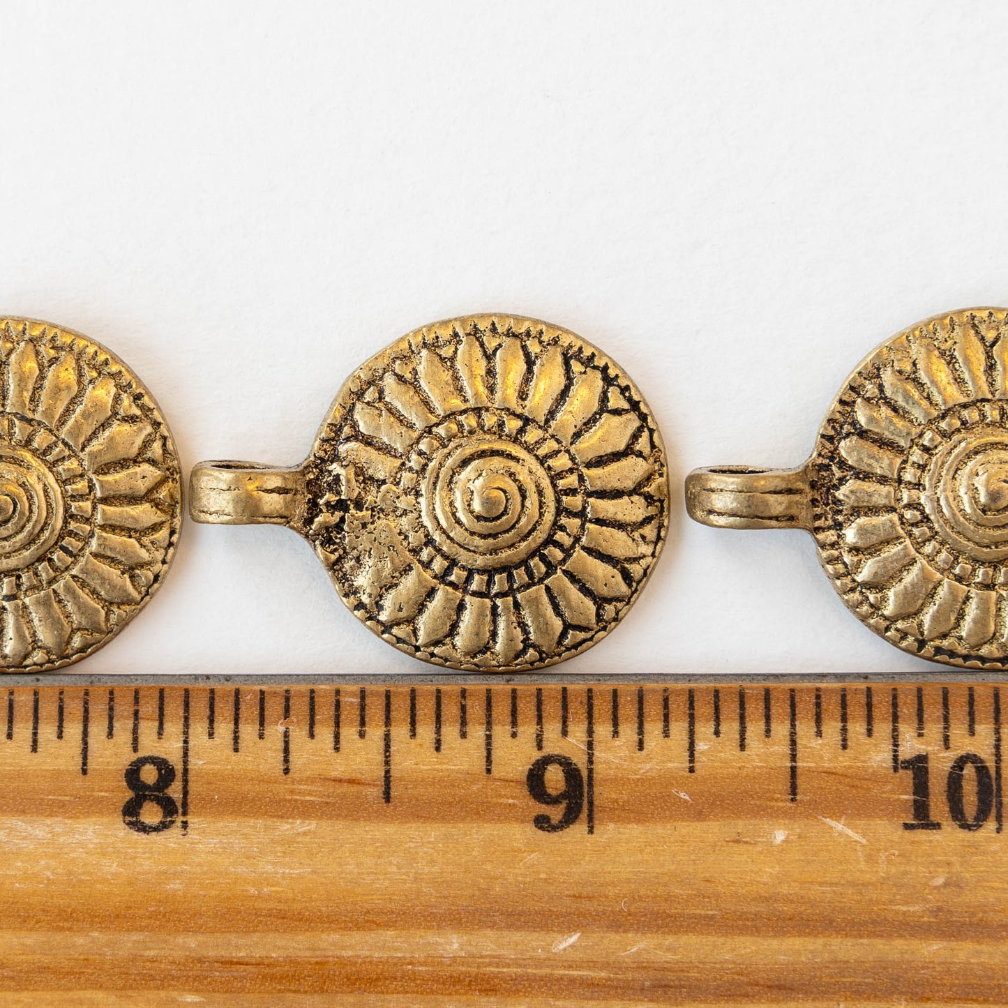 Metal Flower Pendant These look like flowers or suns with a spiral in the center.