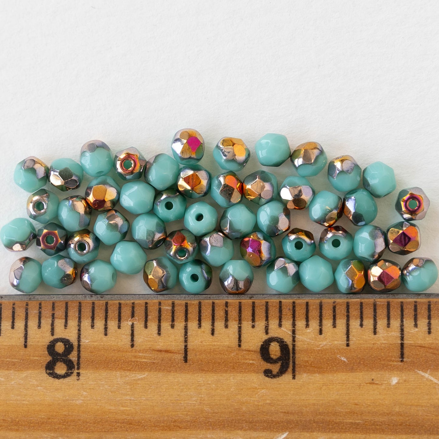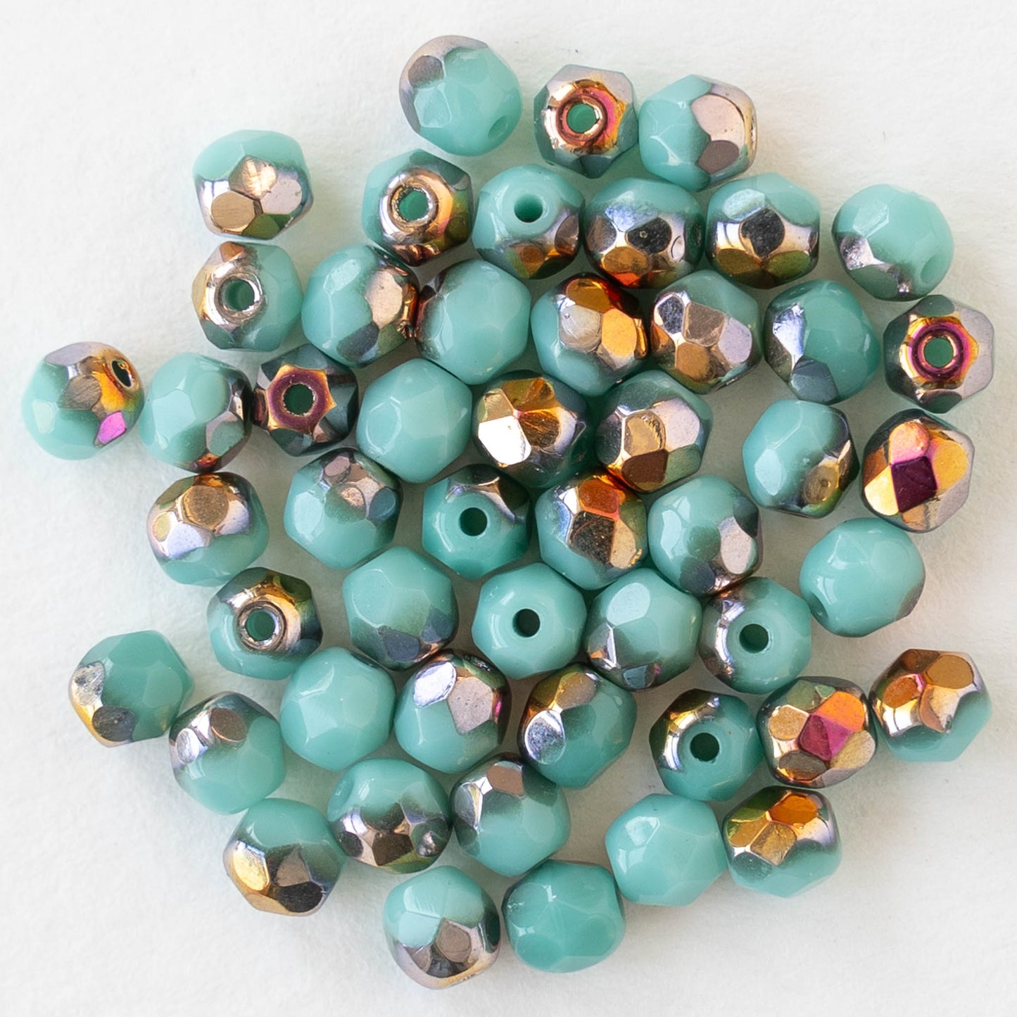 4mm Round Faceted Glass Beads - Turquoise with Crimson Gold- 50 Beads