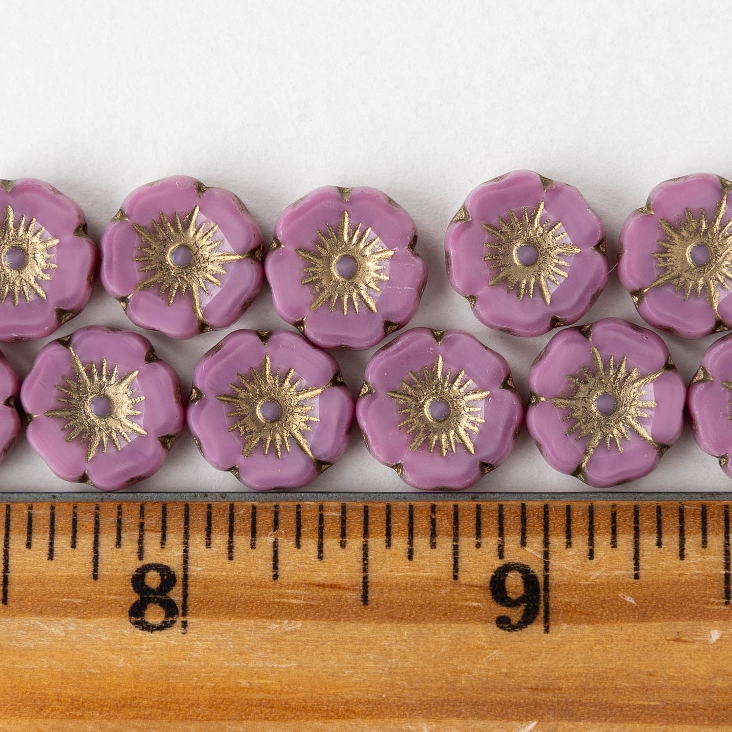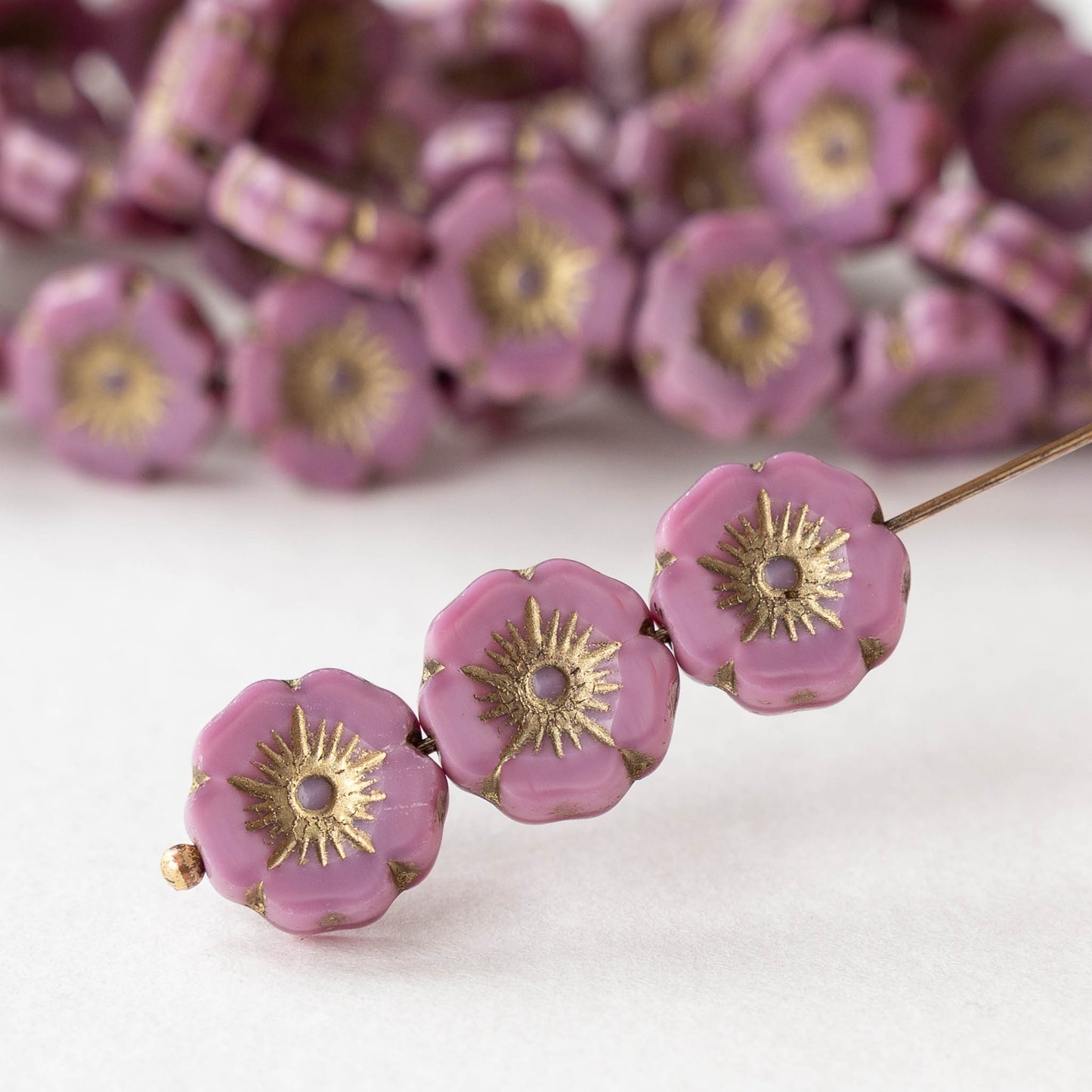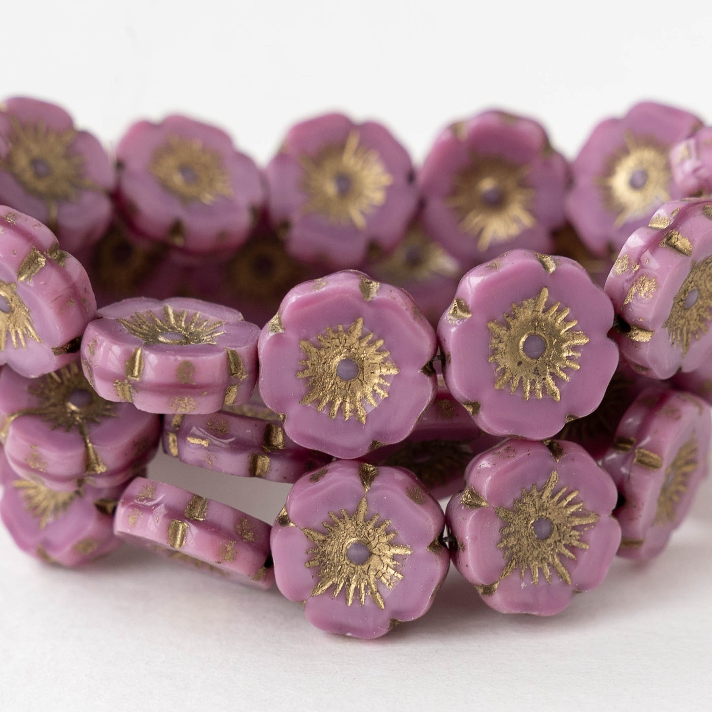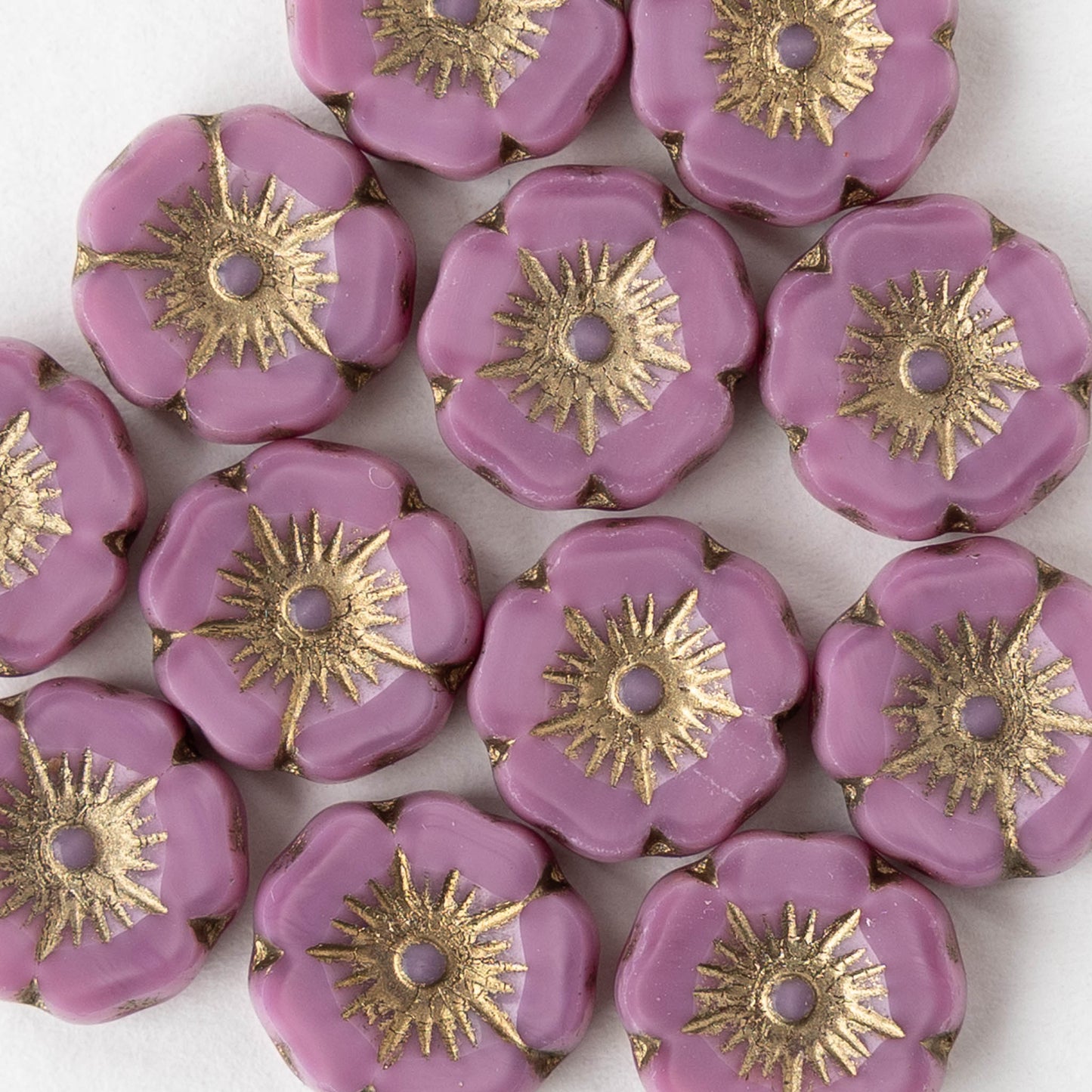 12mm Table Cut Glass Hibiscus Flower Beads - Opaque Pink Silk with Gold Wash - 6 or 12 Beads