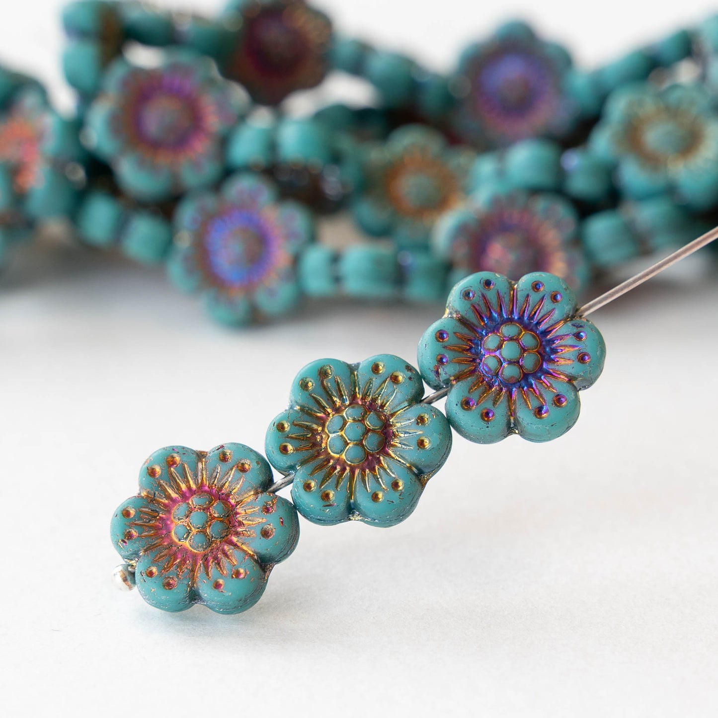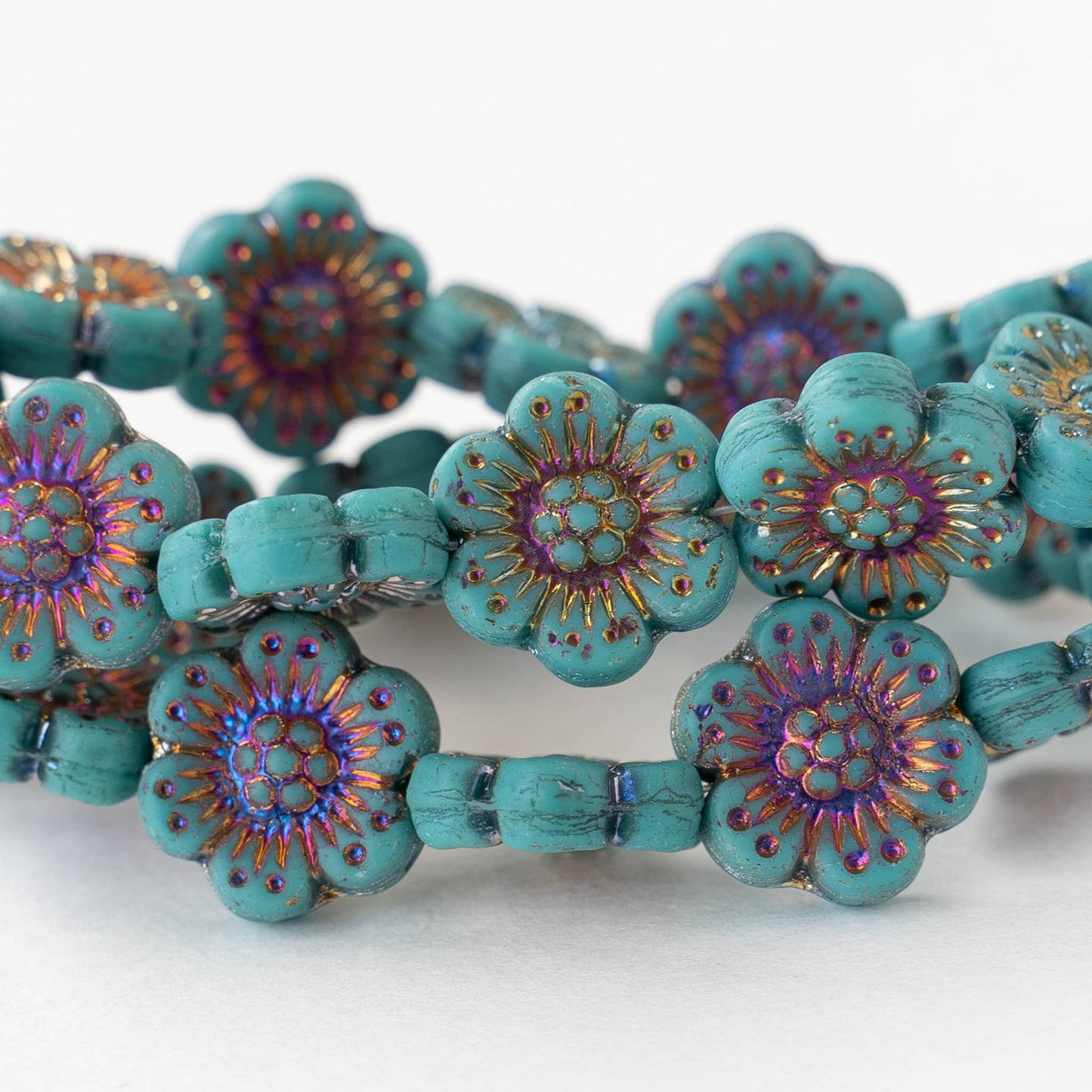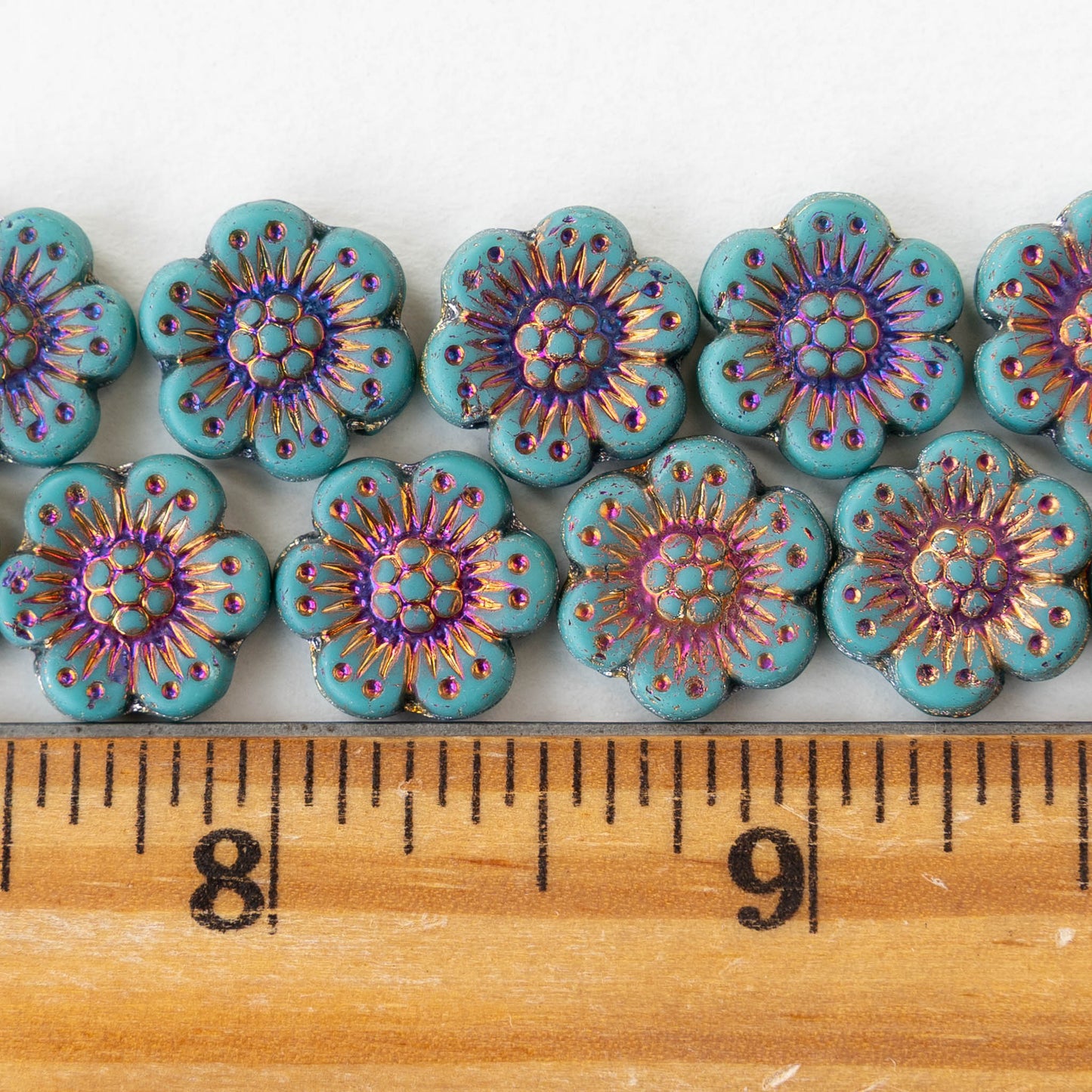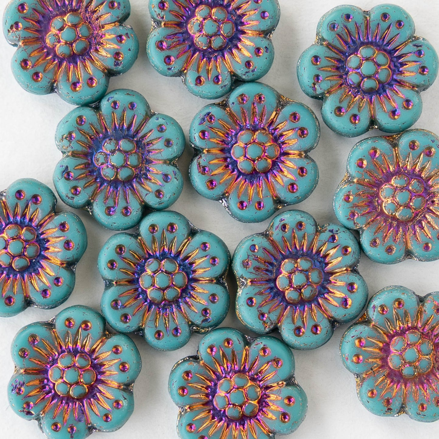14mm Glass Flower Beads - Turquoise with Iris Wash - 4 or 12 beads
