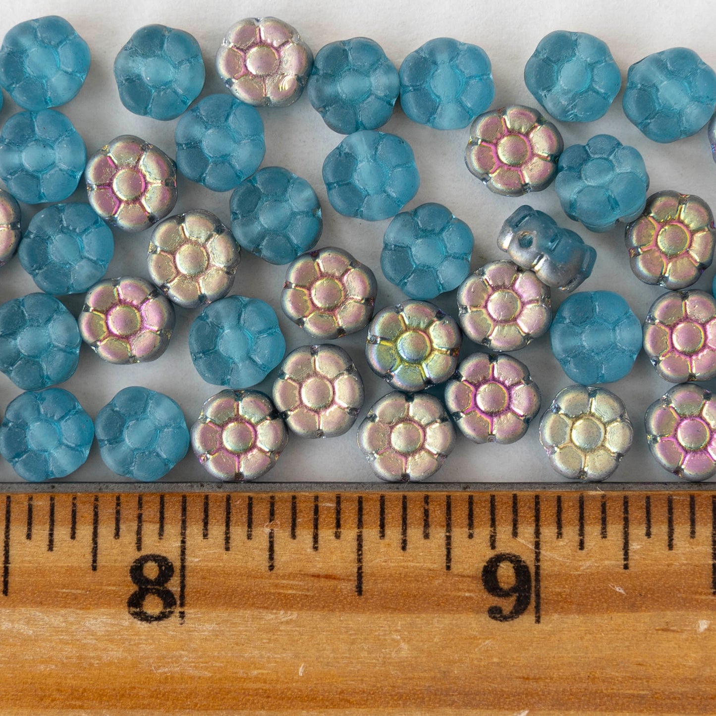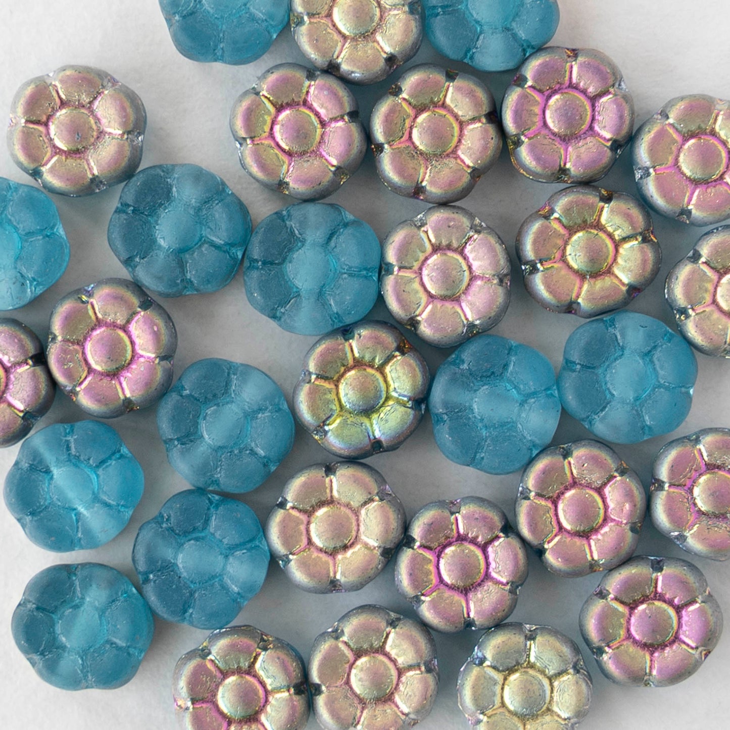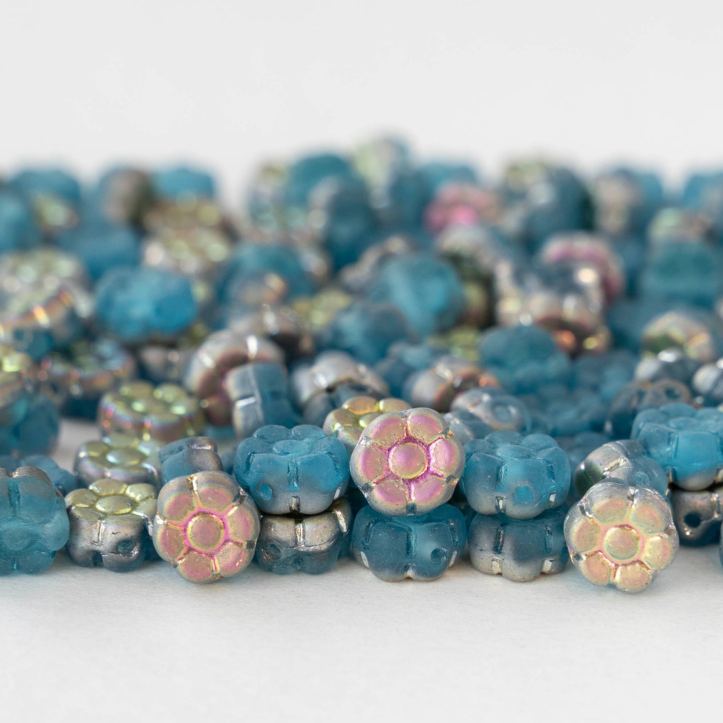 7mm Glass Flower Beads - Blue Metallic Pink Green - 50 Beads