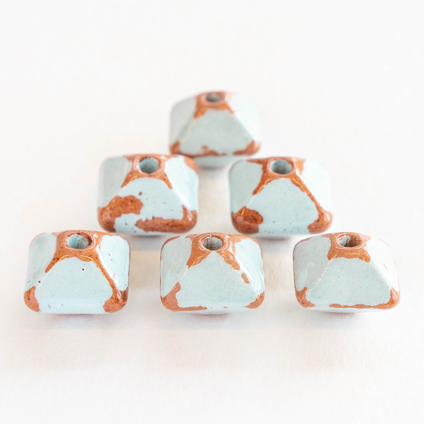 Glazed ceramic octahedron cube beads. Terracotta brown clay shows through a light blue glaze creating a lovely contrast. These Mykonos Greek beads have a wonderful earthy, natural look.
