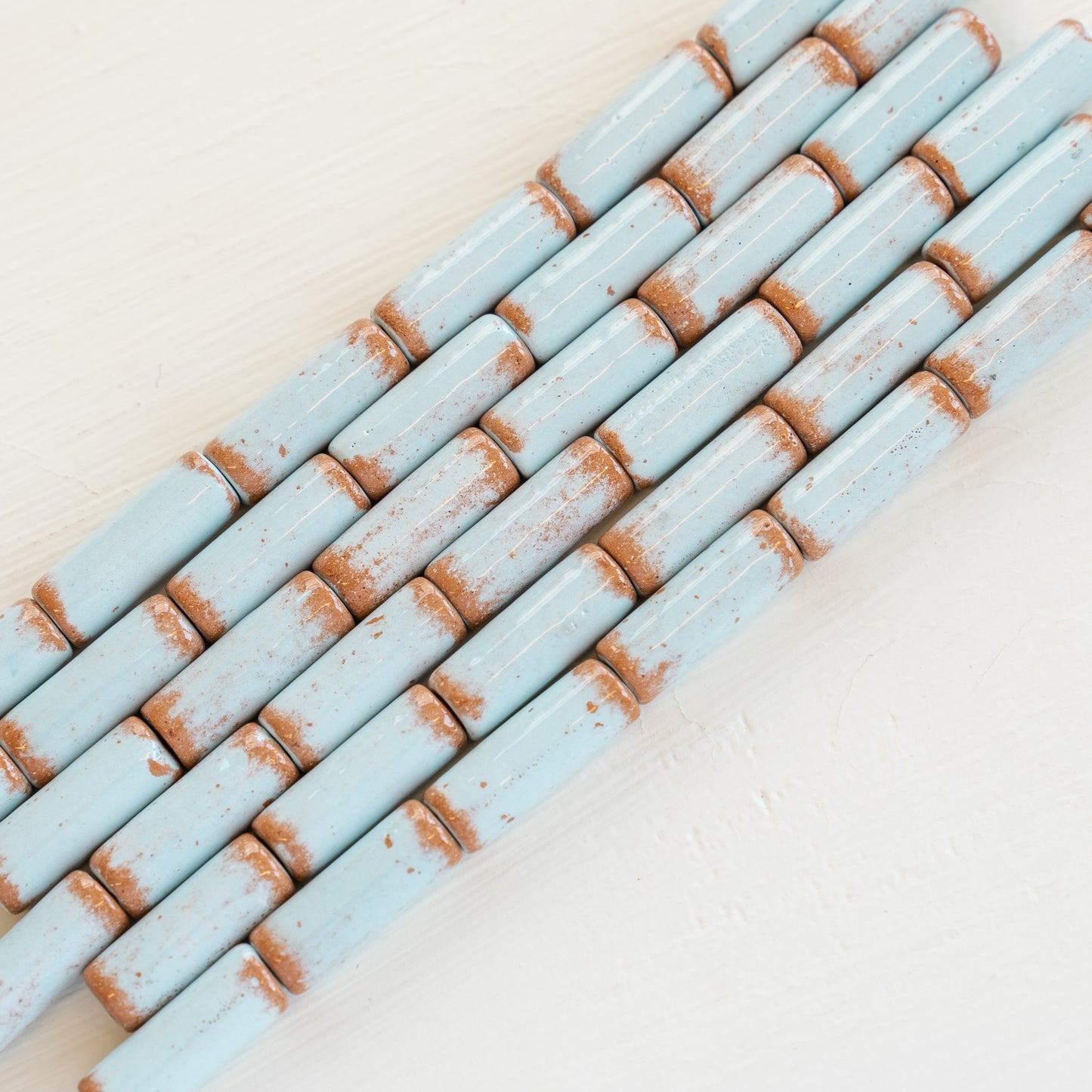 Glazed ceramic tube beads from Mykonos Greece. Terracotta clay shows through a gentle, light blue glaze for a subtle contrast.
