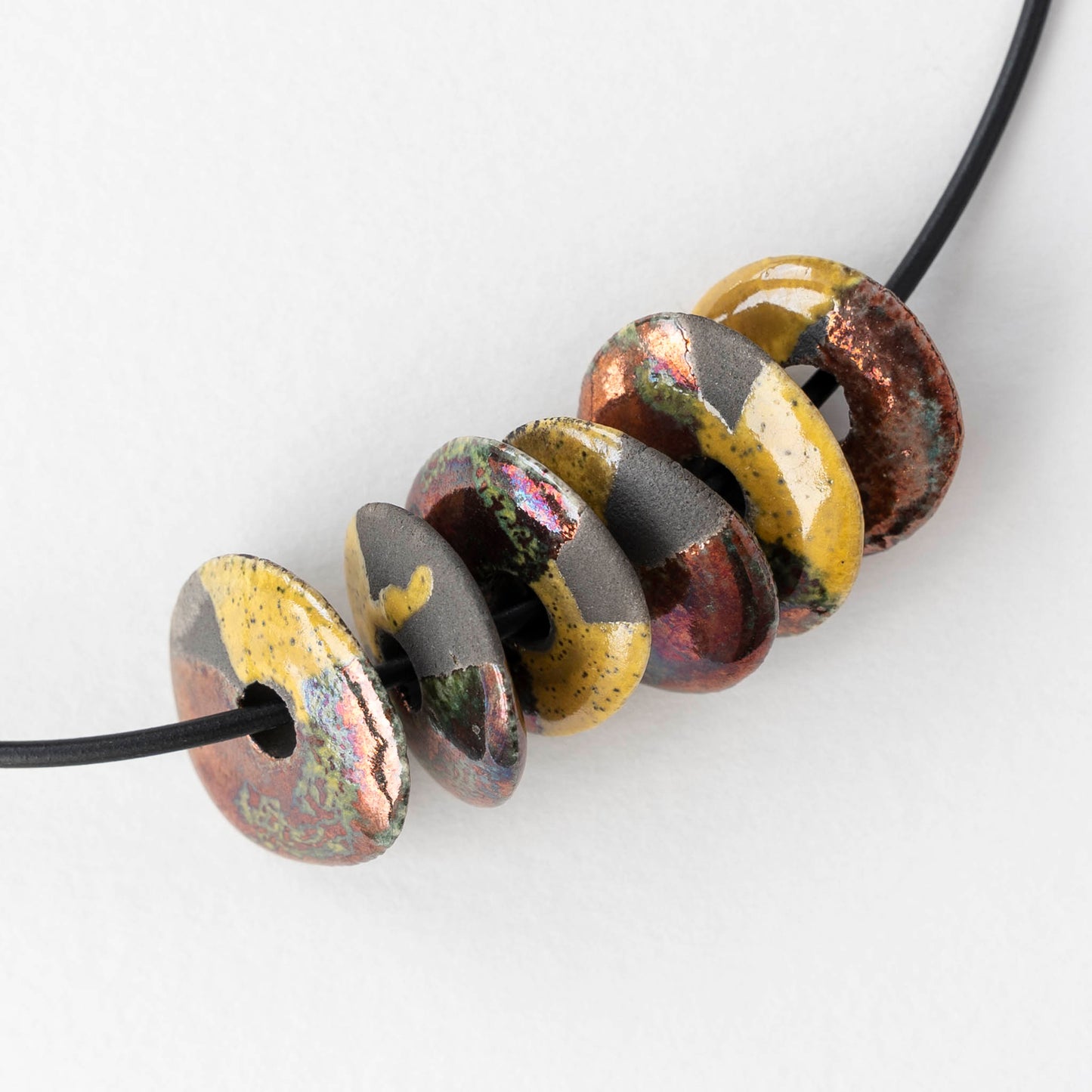 These handmade ceramic beads are fired using the Japanese Raku technique.
