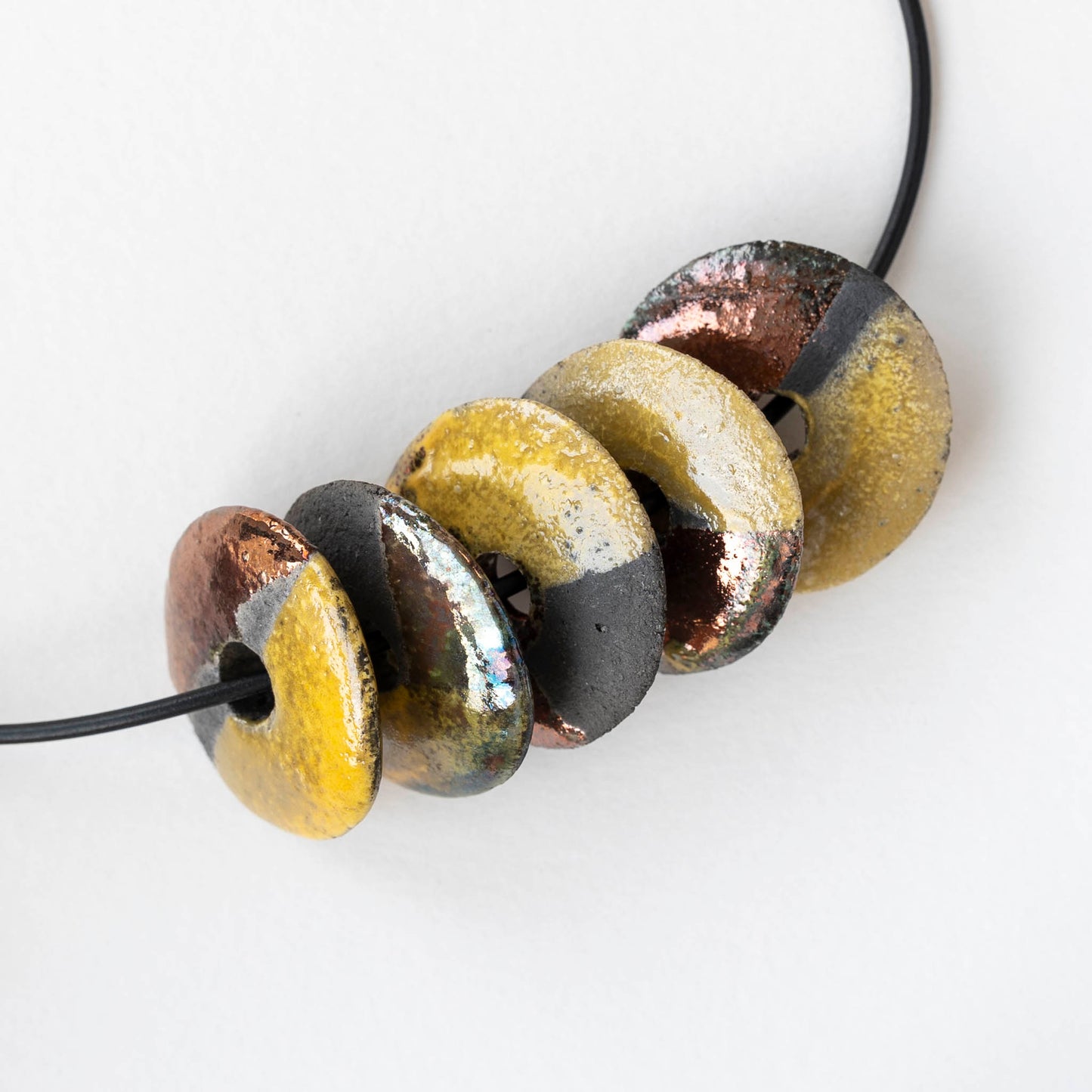 These handmade ceramic beads are fired using the Japanese Raku technique.