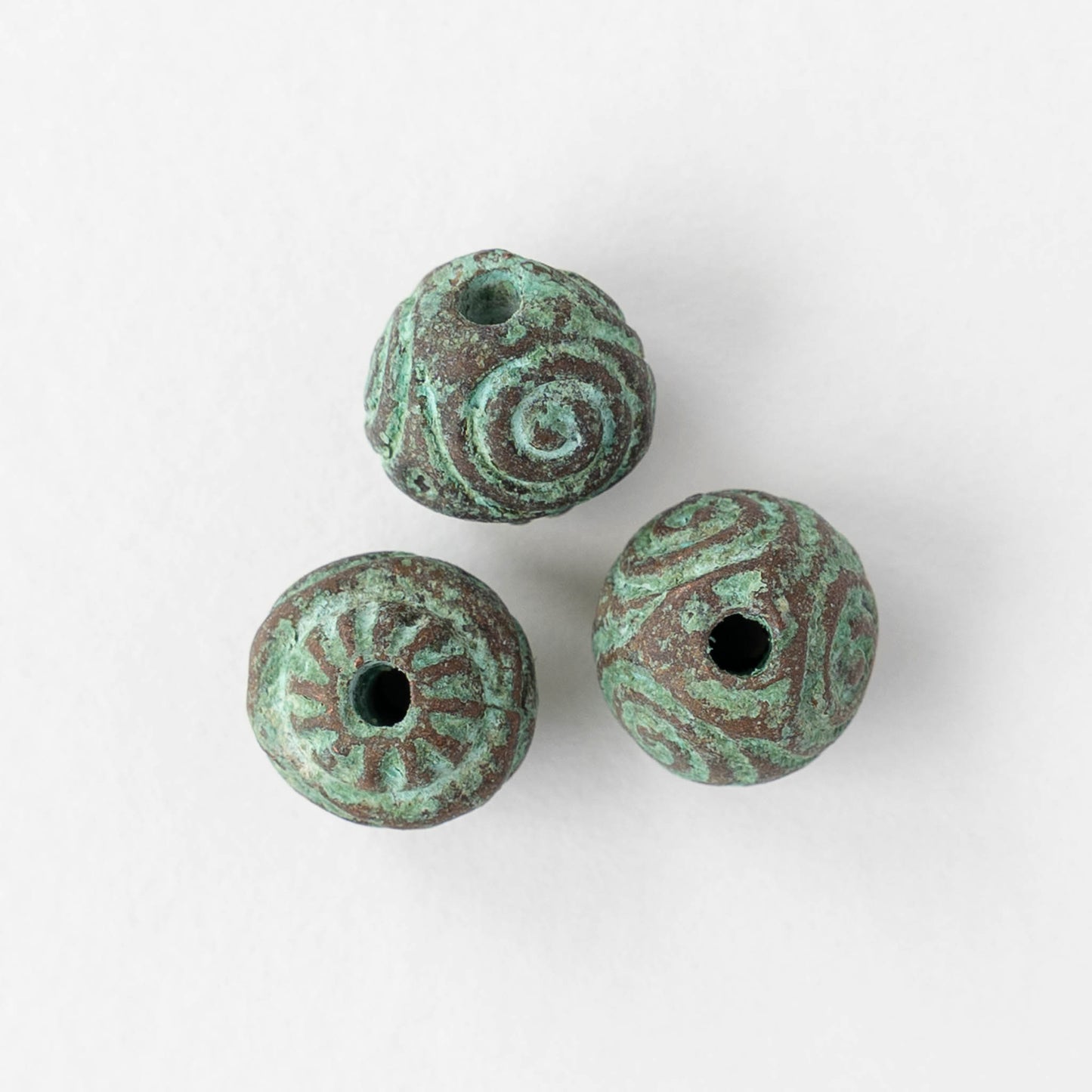 Mykonos Casting beads start with a lead-free metal alloy, and are then plated with copper and a green patina.