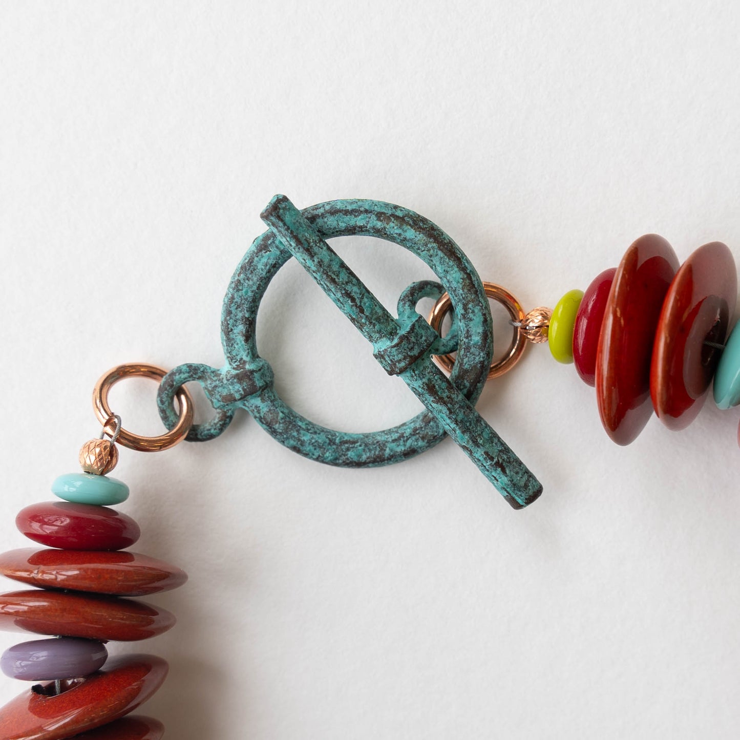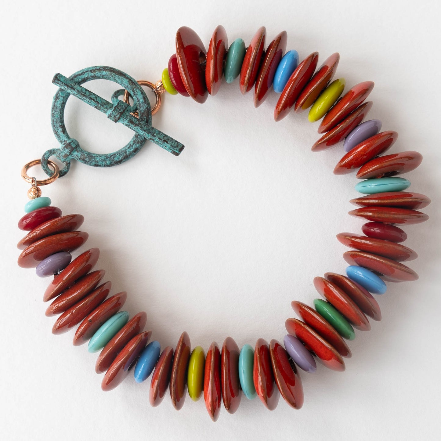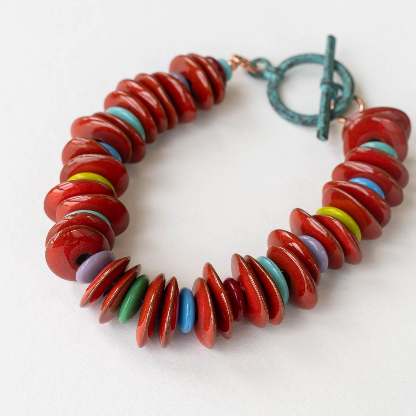 Add a pop of color and fun to your outfit with this beaded bracelet! This unique design features bold ceramic disk beads in opaque crimson red from the island of Mykonos. Czech glass disk beads in fun colors add the perfect playful accent.