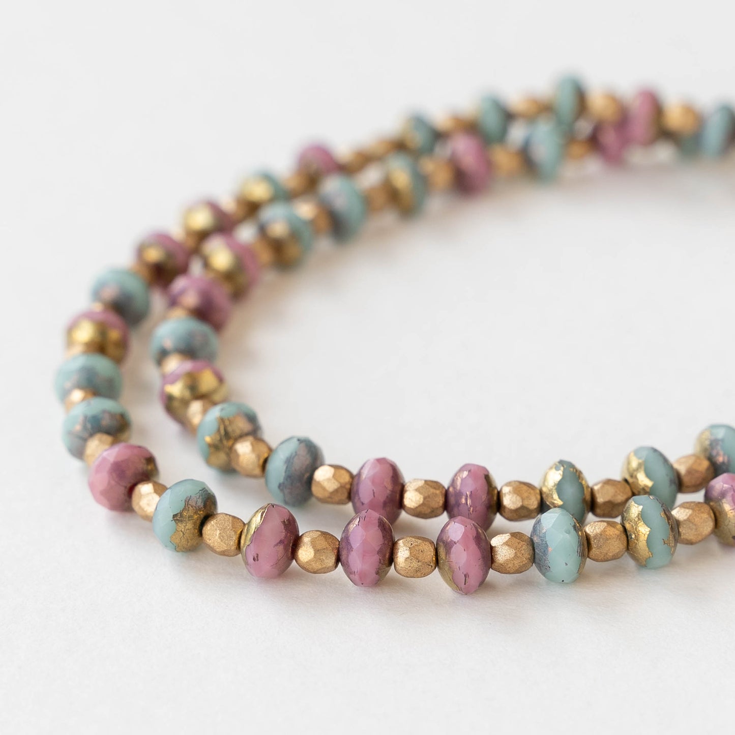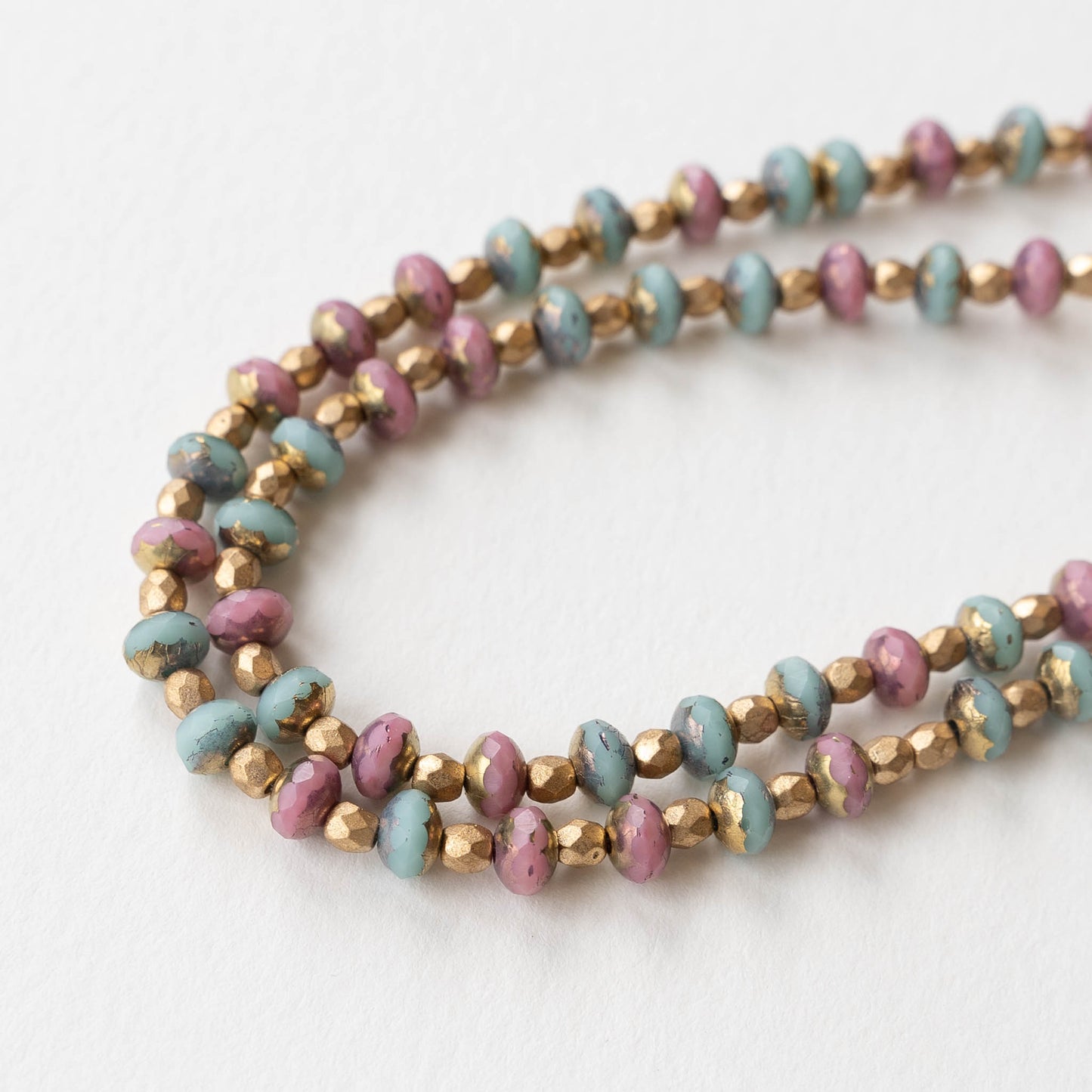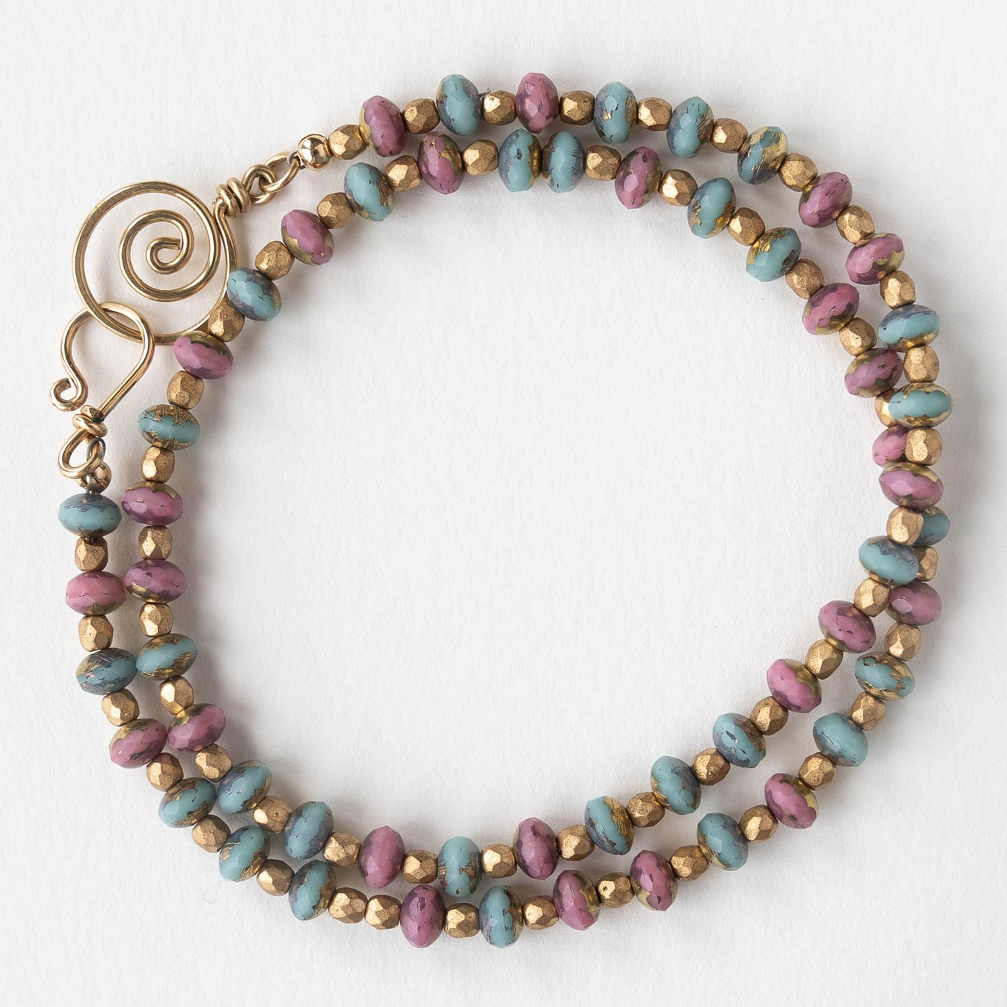 Sweet pastel mix of pink and aqua rondelles , accented with tiny matte gold glass beads and Finished with a handmade spiral clasp.