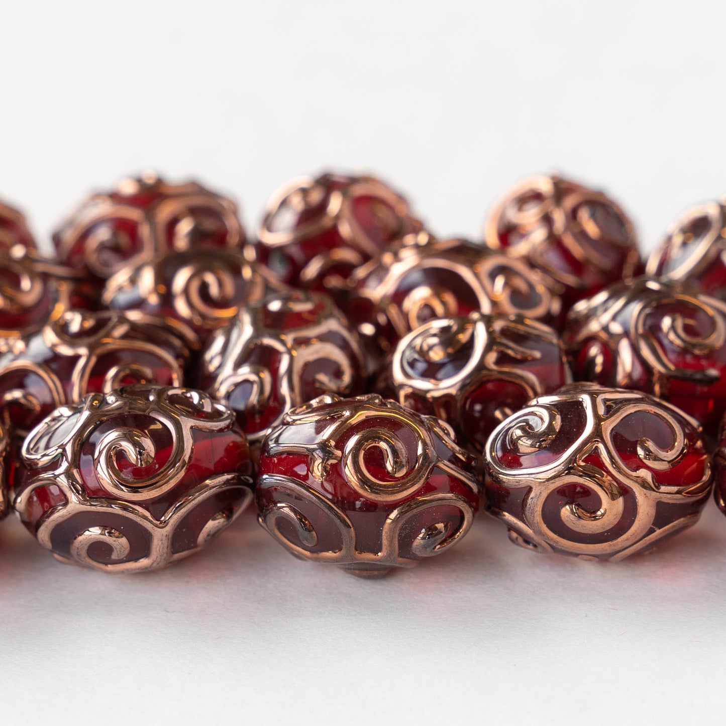 These exquisite handmade Czech beads are made using a glasswork technique called lampwork. Molten glass is layered and shaped to create both simple and intricately decorated glass beads. Our lampwork beads are made by artists in a small factory located in Jablonec Nad Nisou in the Czech Republic. We carry round, oval, tube, rectangle, and square lampwork beads in various sizes. They come in a few different variations: foil lined, decorated with a copper florentine design, and simple colored glass with copper edges.