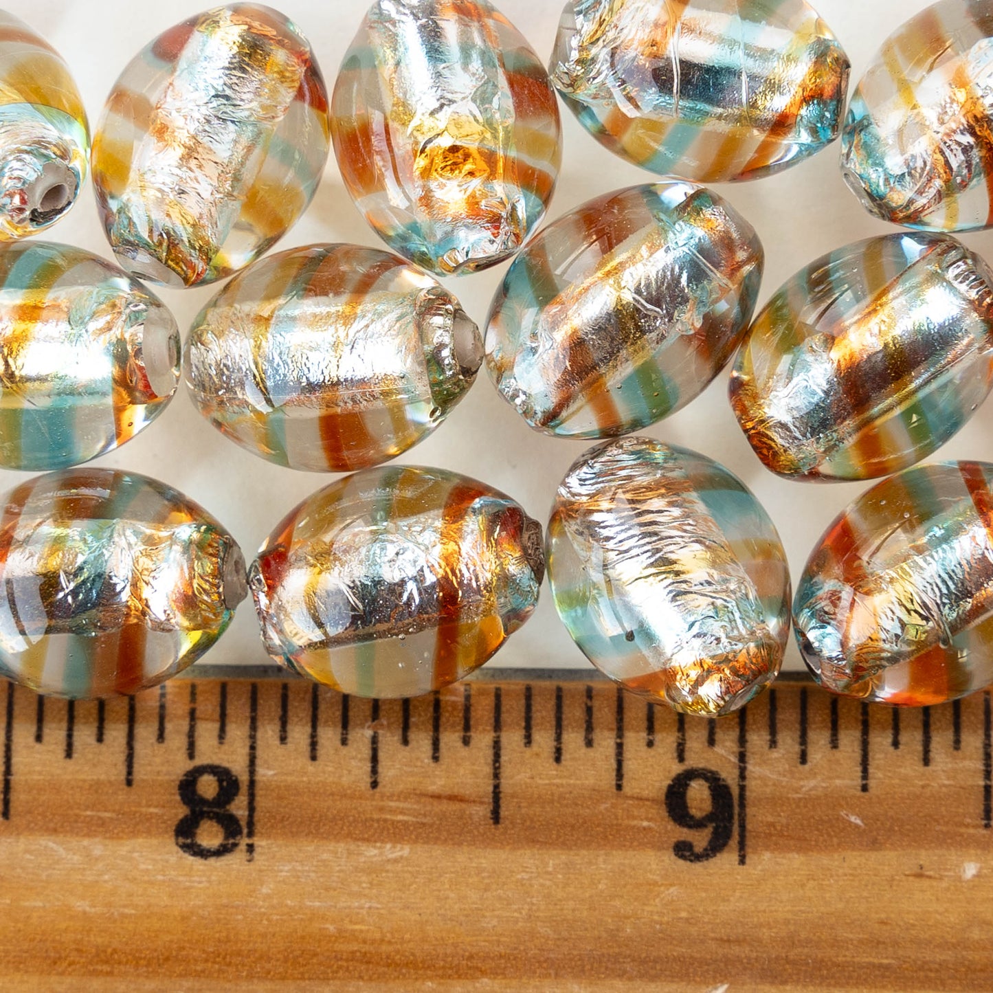 12x15mm Lampwork Oval Beads - Crystal with Blue and Orange Stripes - 2 Beads
