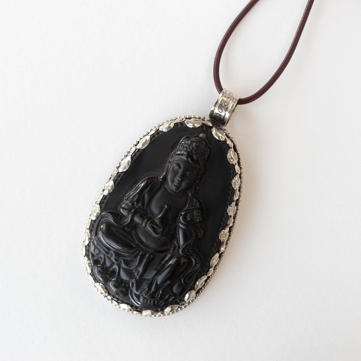 65mm Sitting Buddha Pendant - Black Matte Obsidian set in Tibetan Silver - 1 piece