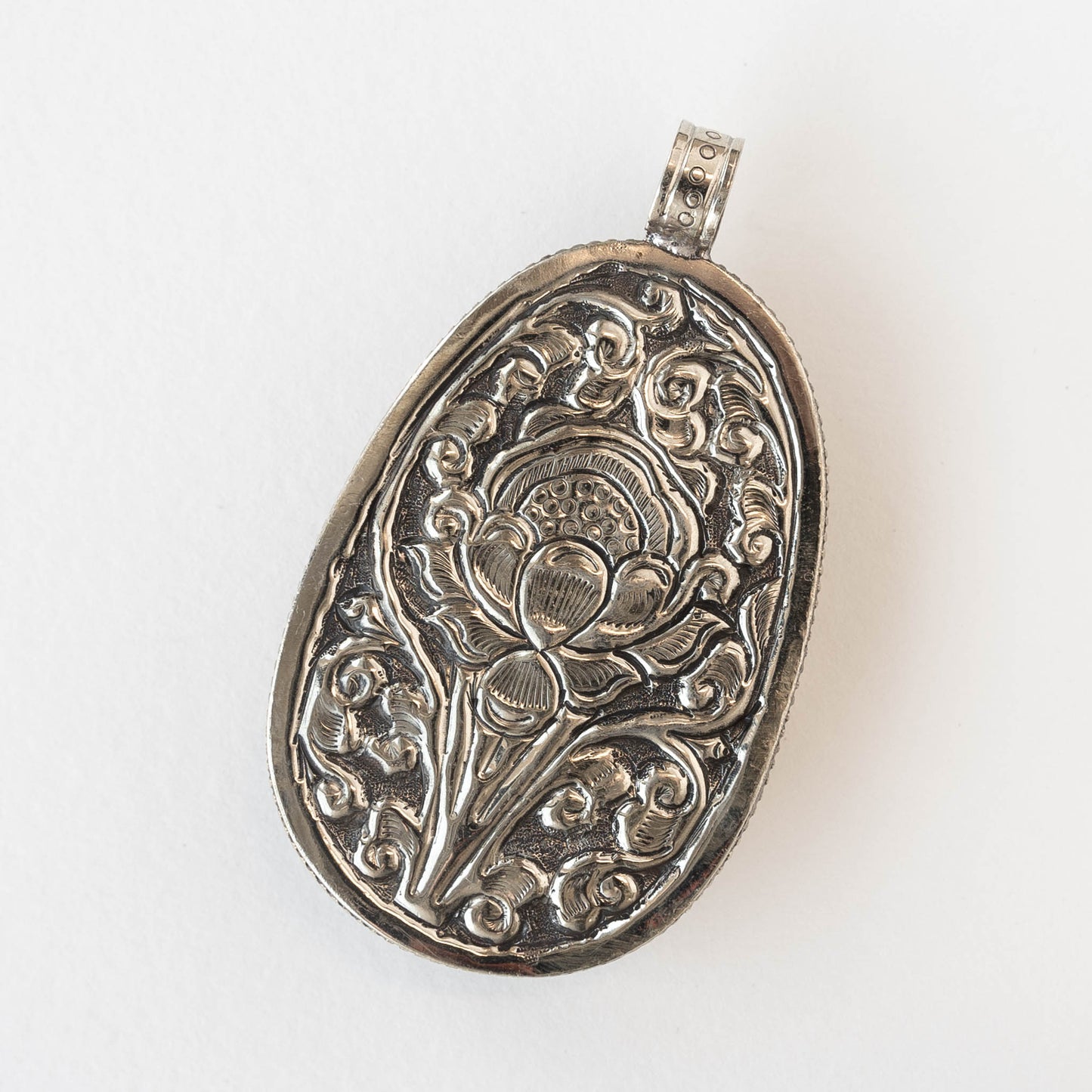 The pendant is set in set in Tibetan silver bezels which are created in the
