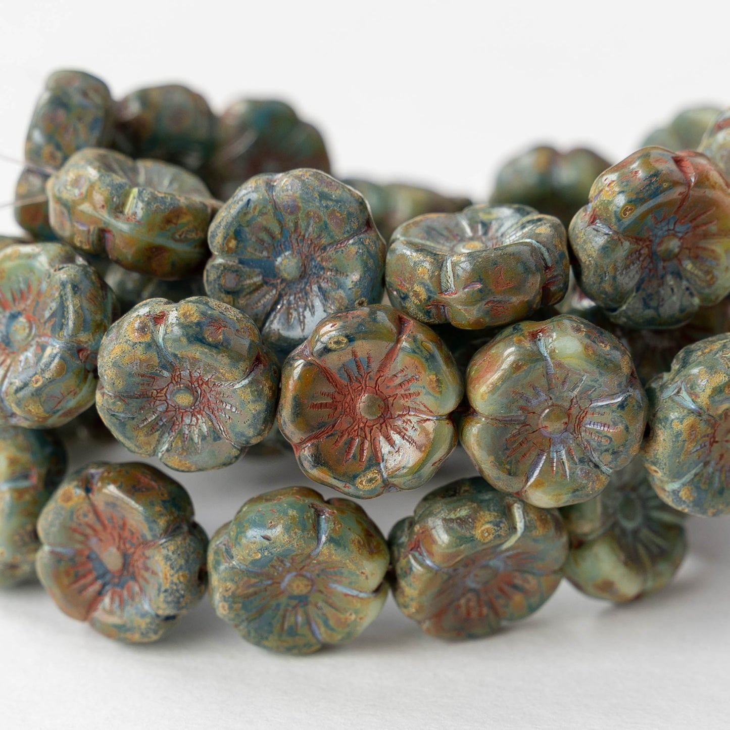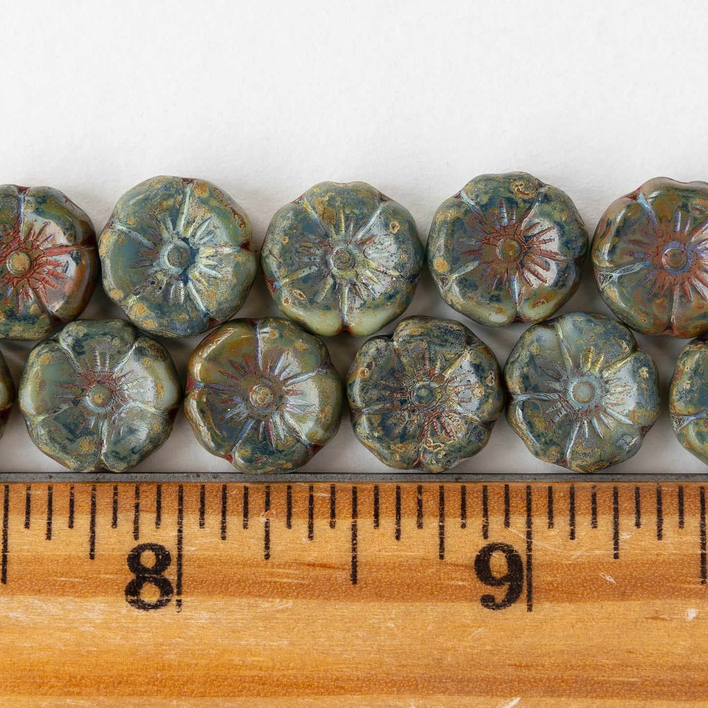 12mm Glass Flower Beads - Green Picasso - 6 or 12 beads