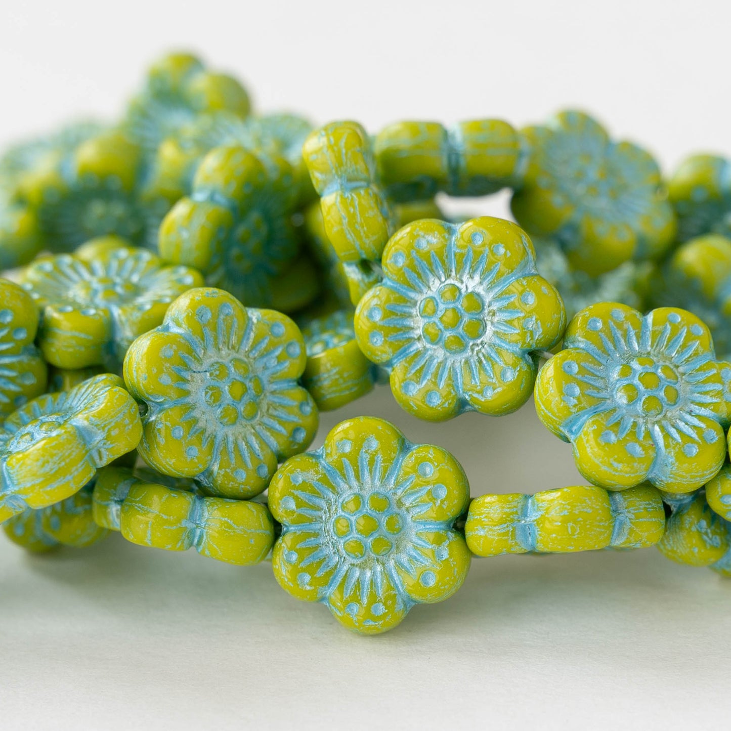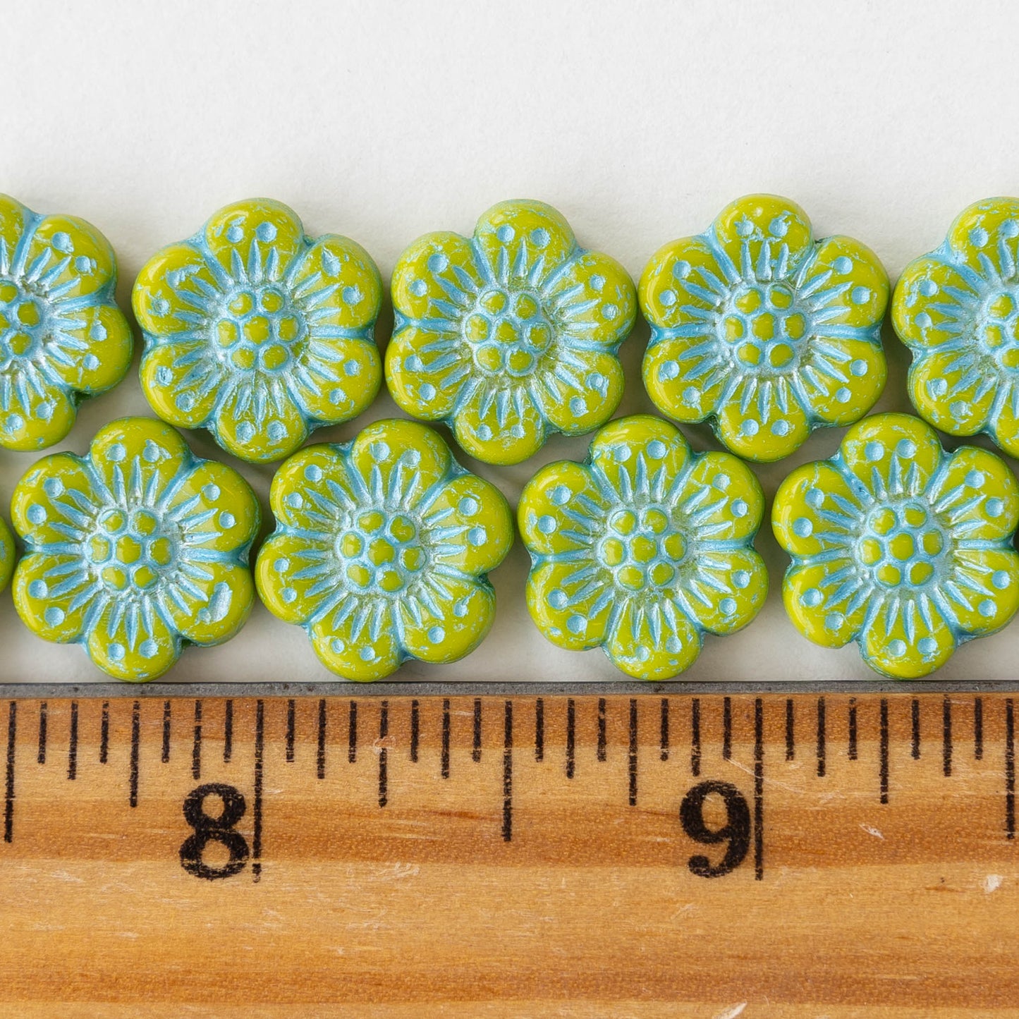 14mm Flower Beads - Lime Green with Blue Wash - 6 or 12 Beads