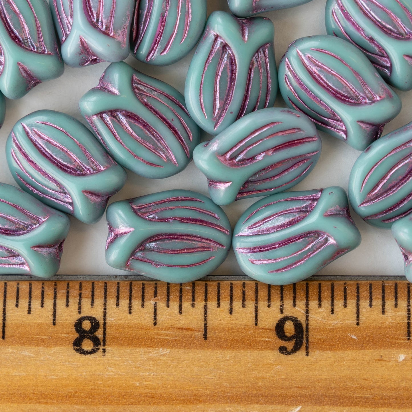 16mm Glass Tulip Flower Beads - Blue Turquoise with Pink Wash - 6 Beads