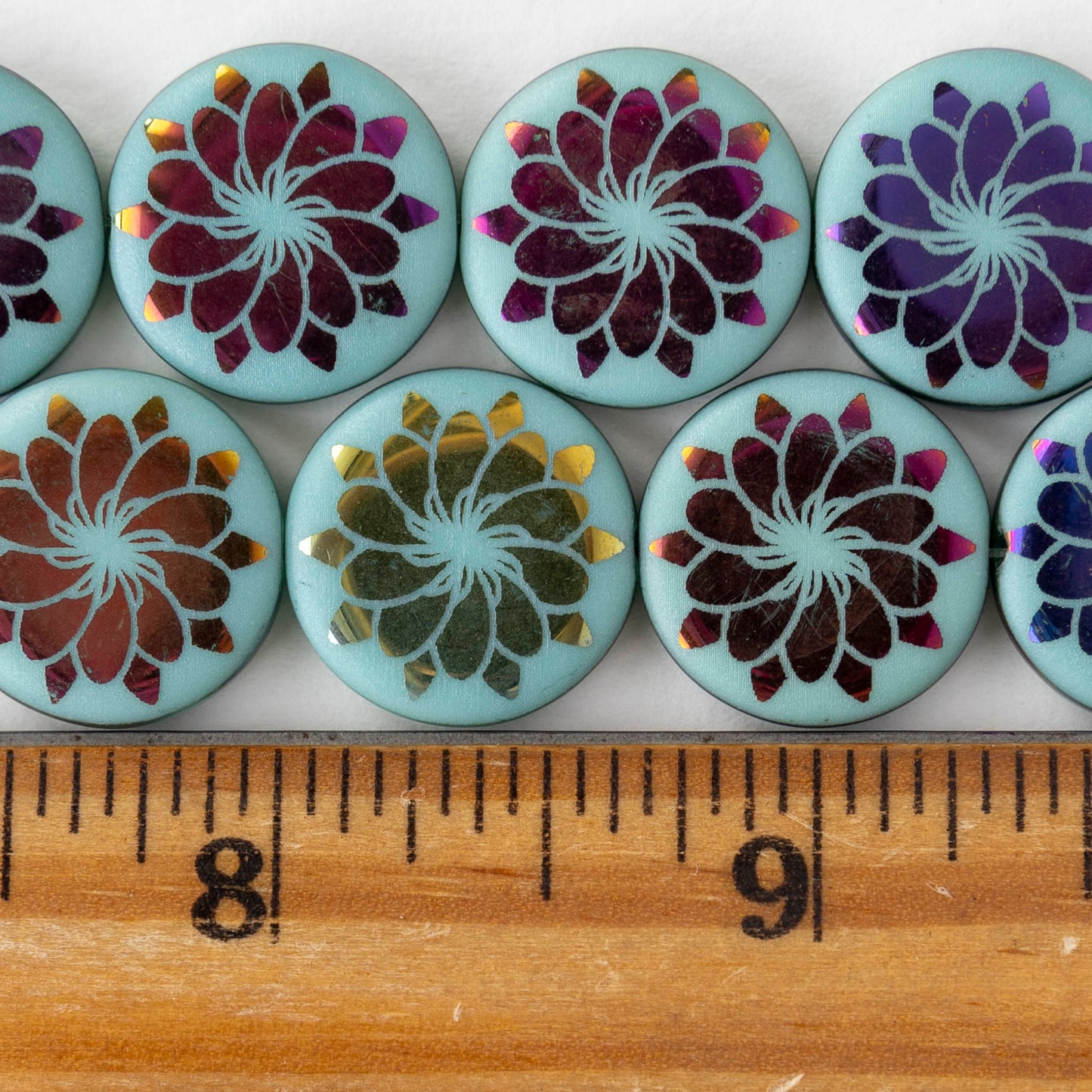 18mm Glass Coin Beads - Turquoise Metallic Flower - 2 or 8 beads