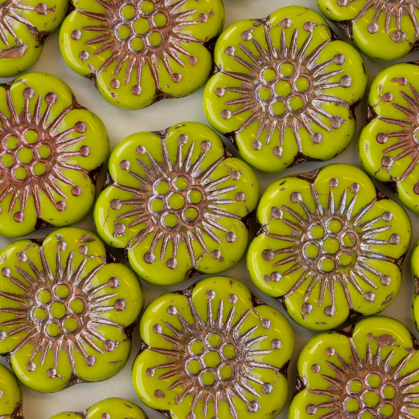 OpaqueLime Green with Copper Wash 18mm flower 4mm thick ~1mm hole