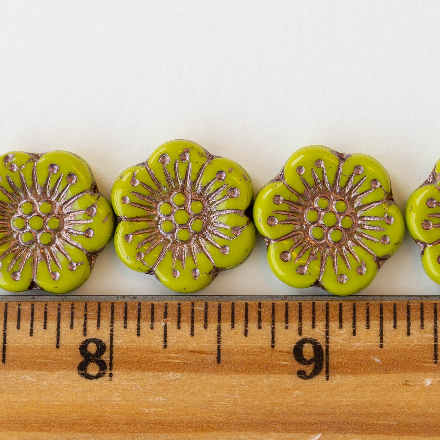 Anemone Flower Beads - 18mm - Opaque Lime Green with Copper Wash - 10 beads