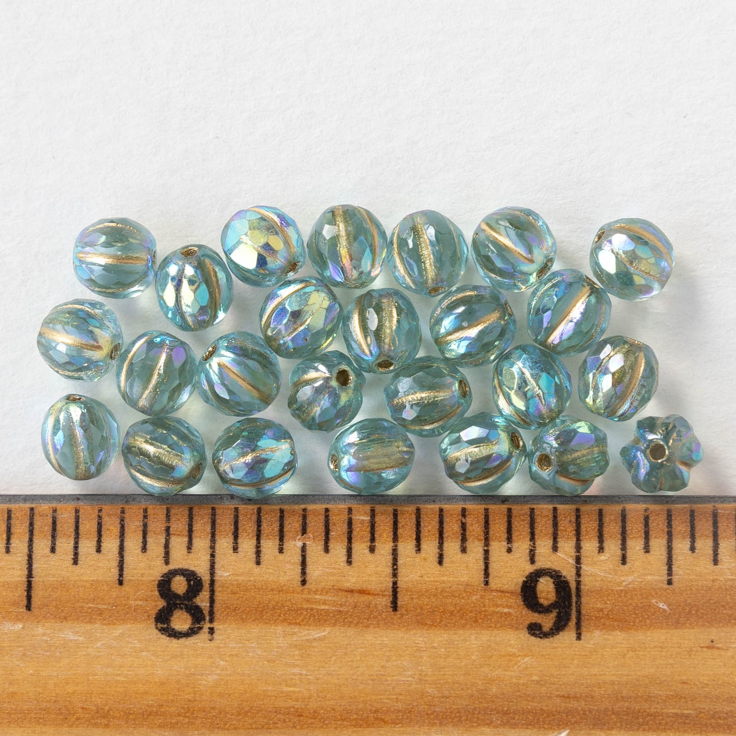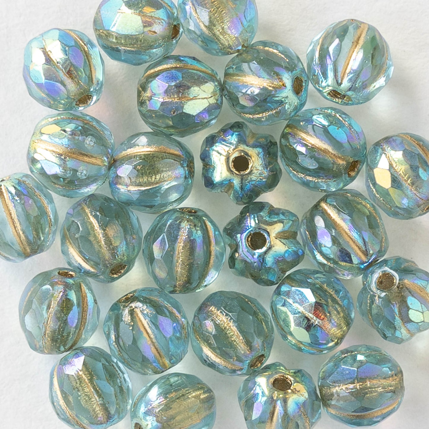 6mm Faceted Round Glass Melon Bead - Gold Lined Seafoam AB - 10 or 20 Beads