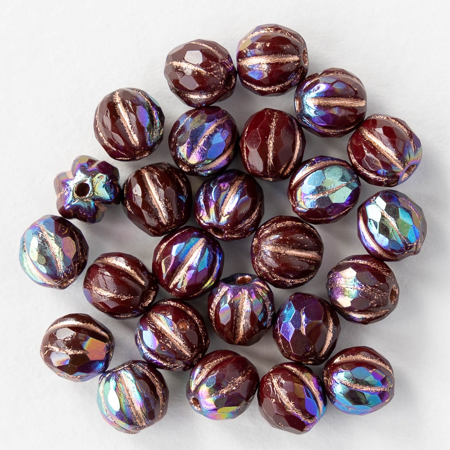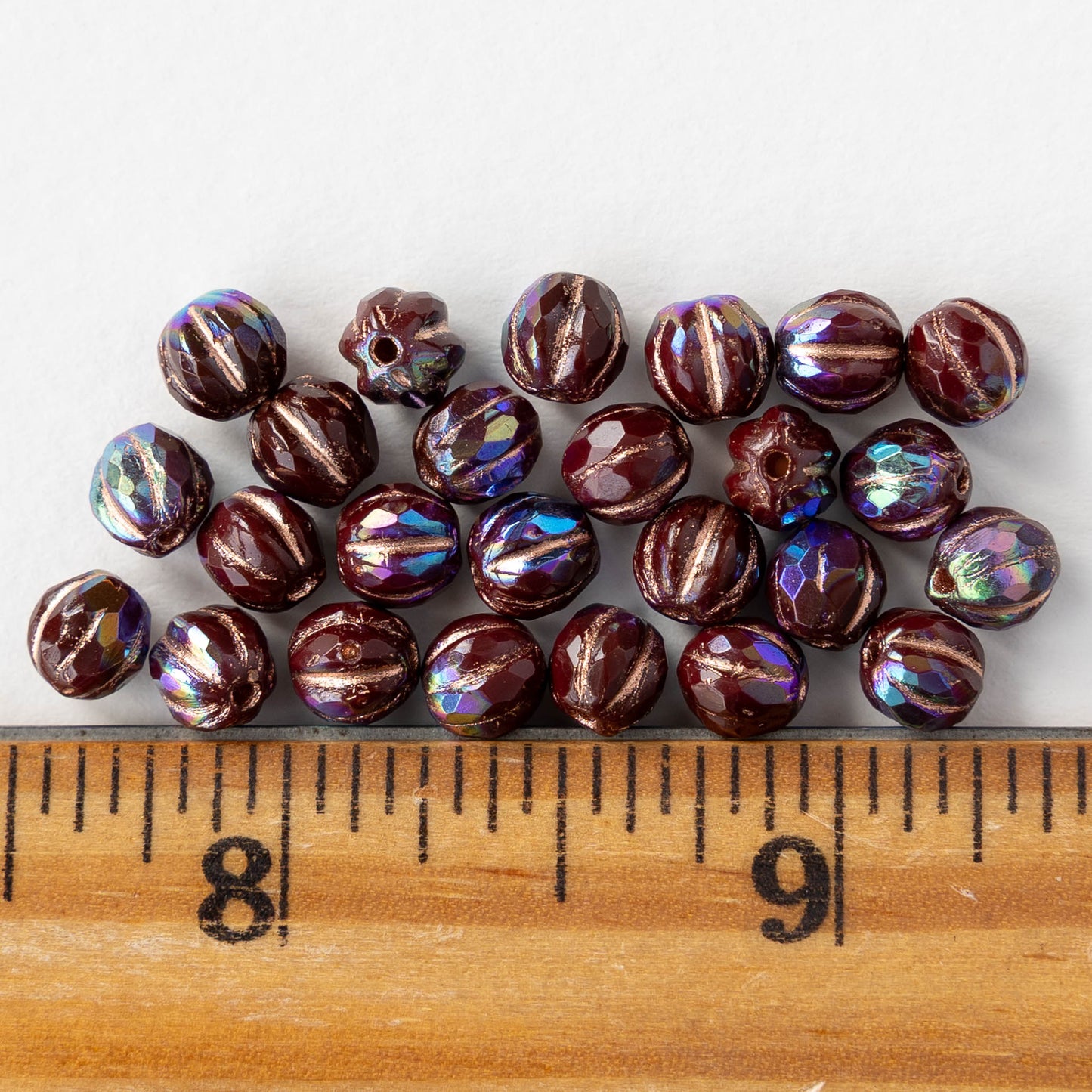 6mm Faceted Round Glass Melon Bead - Maroon AB with Copper Wash - 10 or 30 Beads