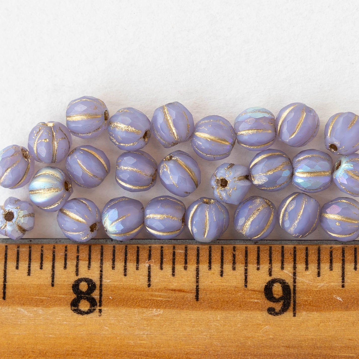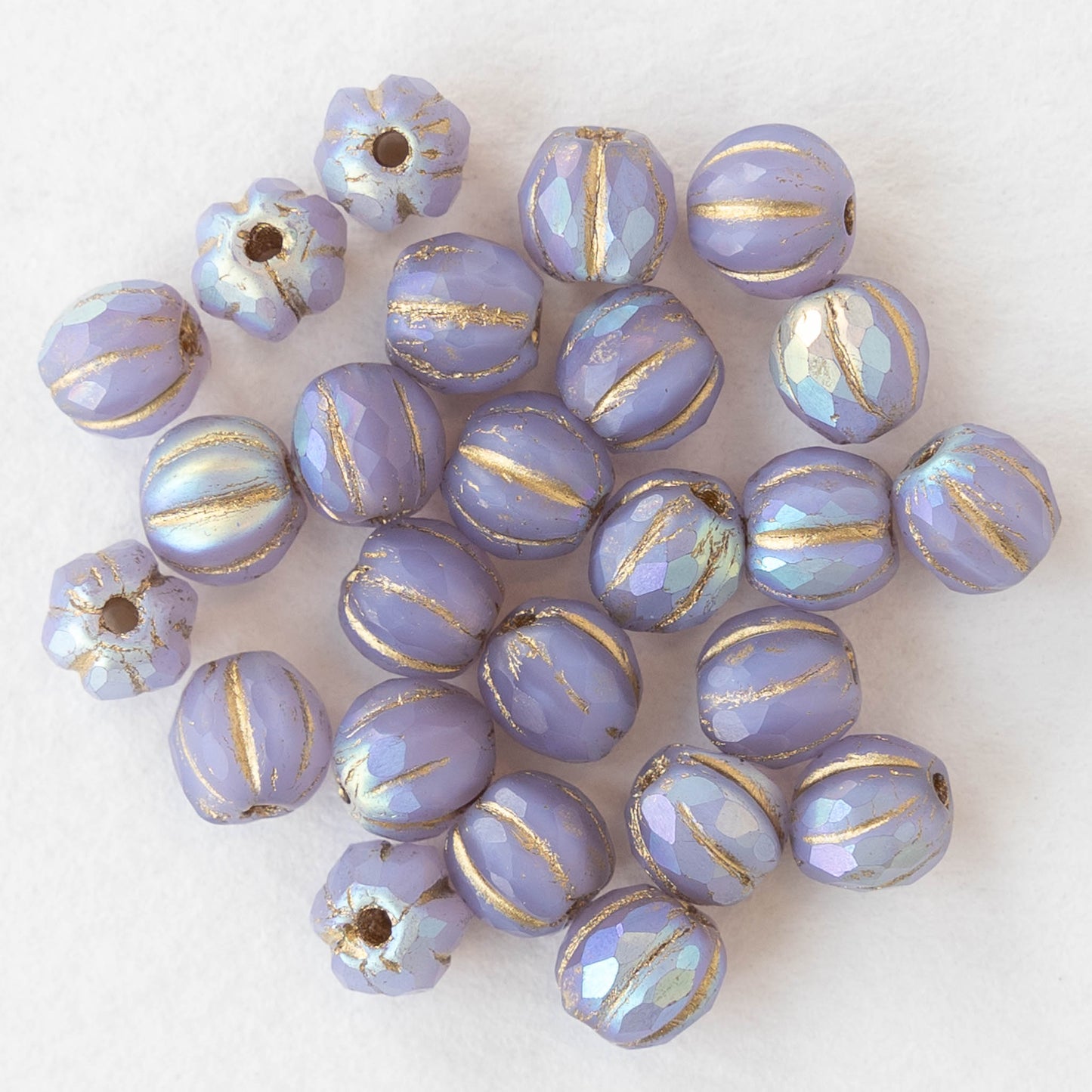 6mm Faceted Round Glass Melon Bead - Opaque Lavender AB with a Gold Wash - 10 or 20 Beads