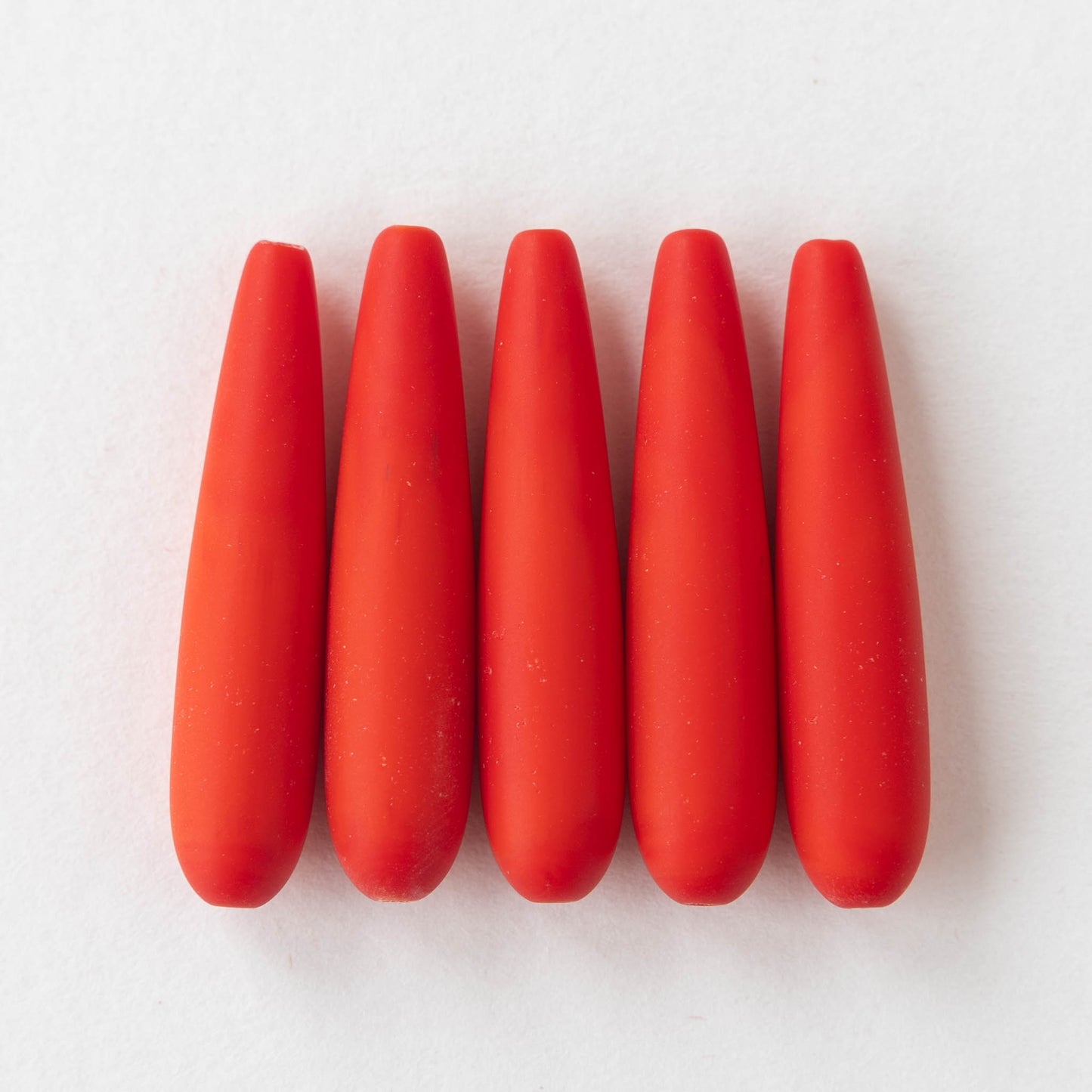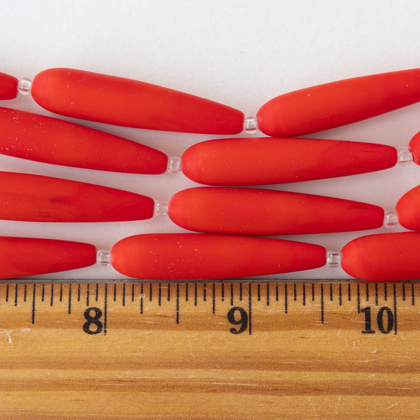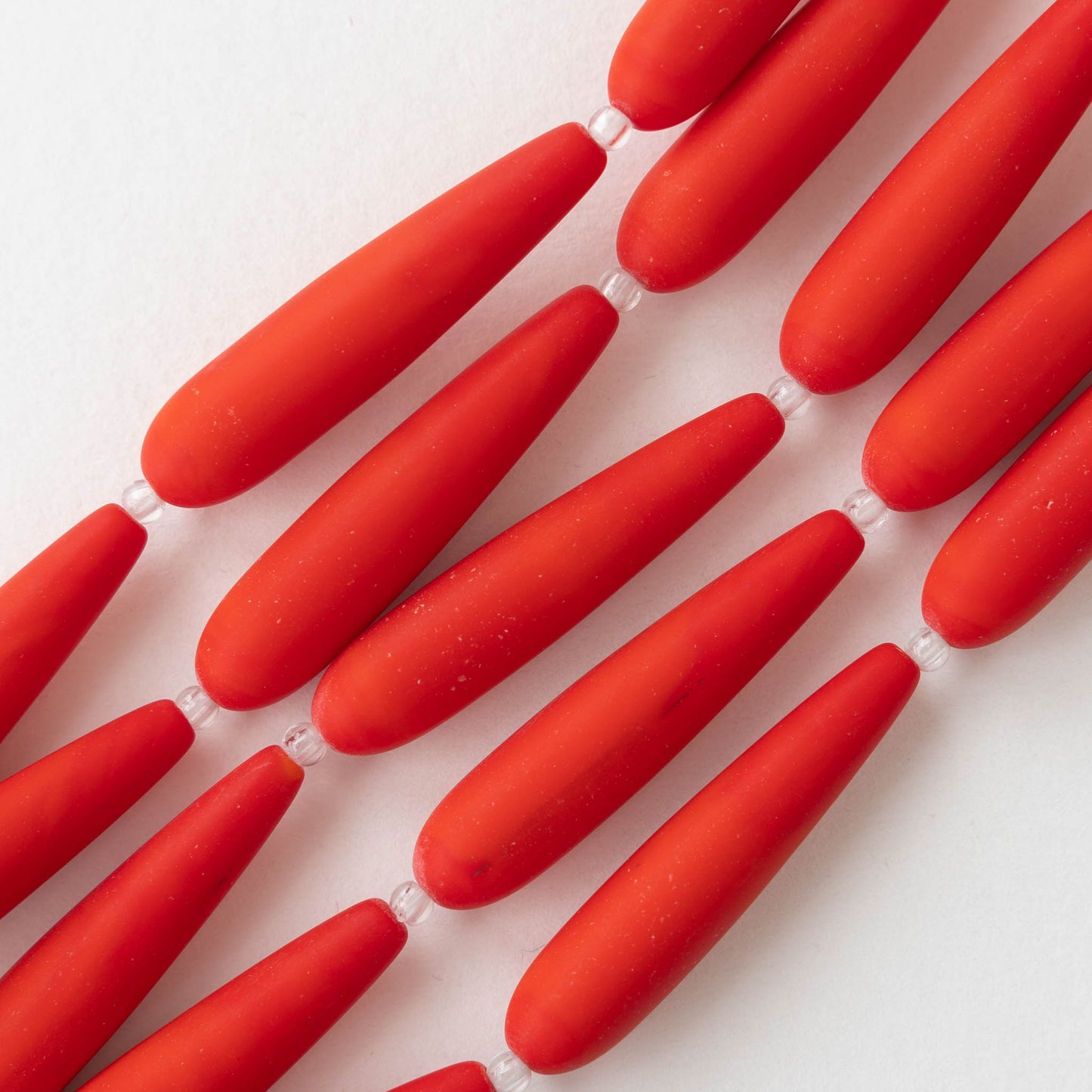 8x38mm Frosted Glass Long Drill Drops - Opaque Bright Vermilion - 4 Beads