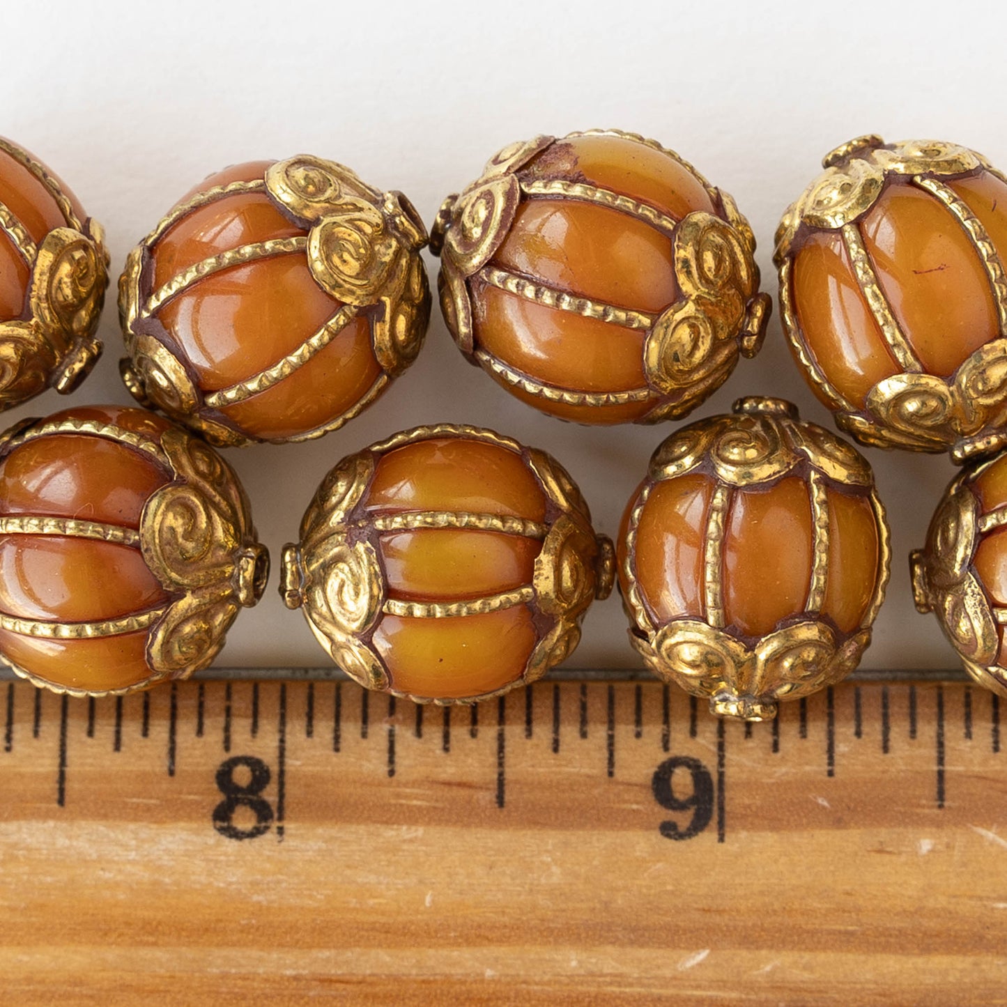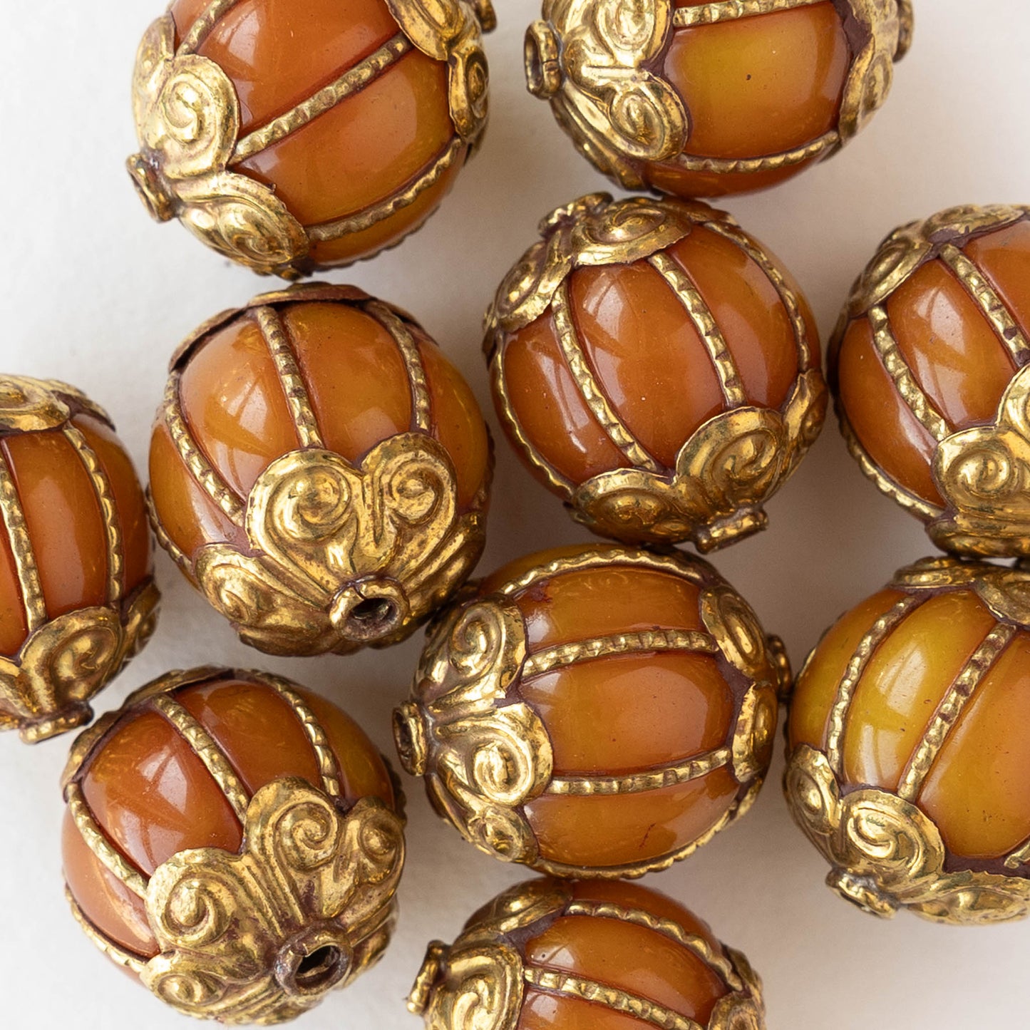 Orange Copal Beads with Tibetan Gold Plate Repoussé Accents