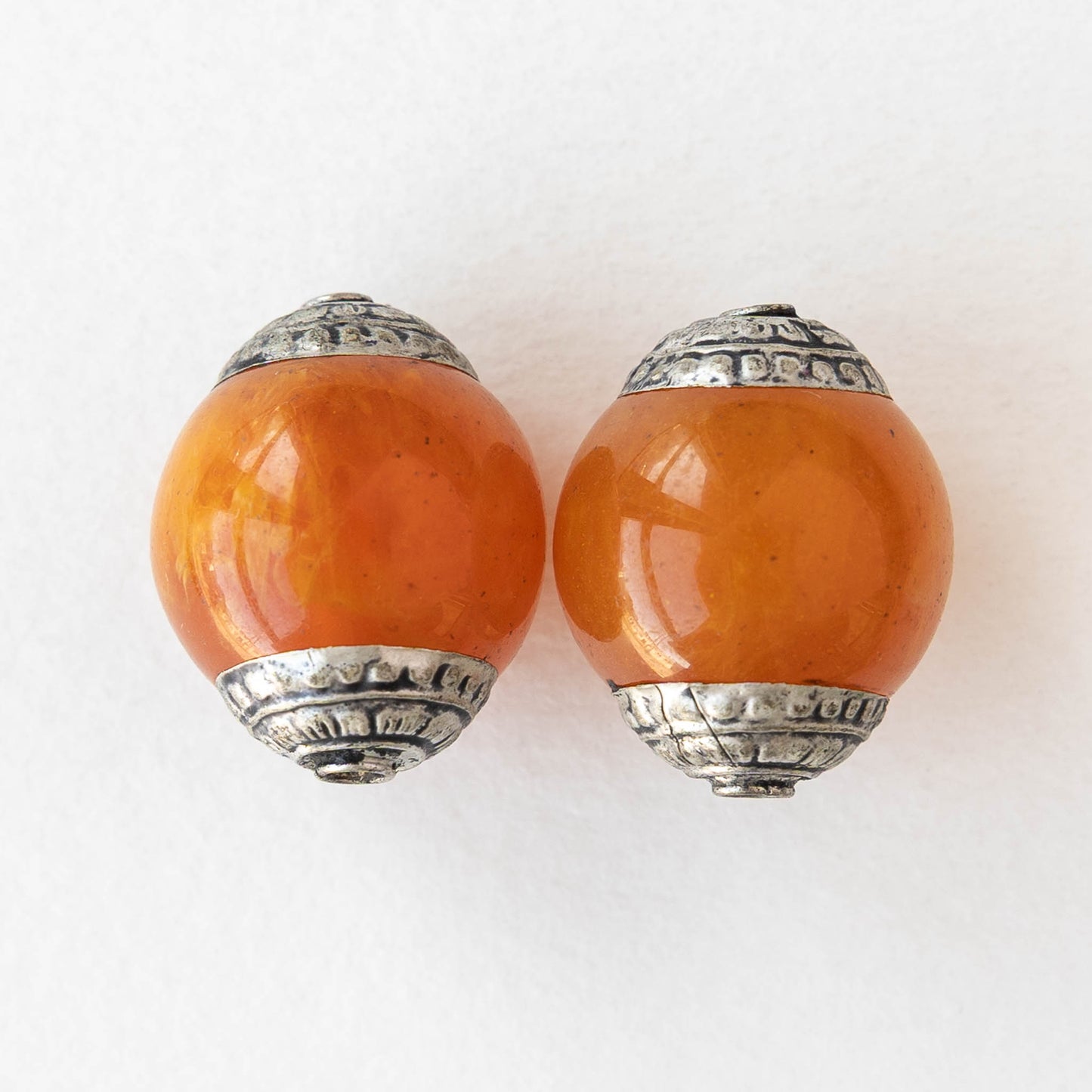 19x25mm Oval Himalayan Copal Beads - Orange with Tibetan Silver - 1 bead