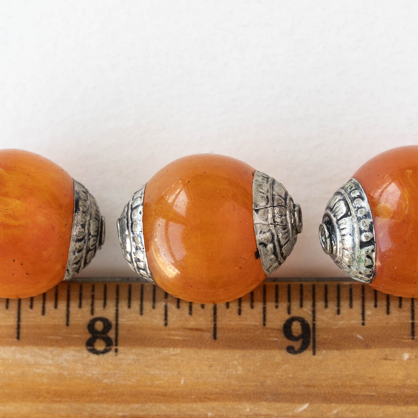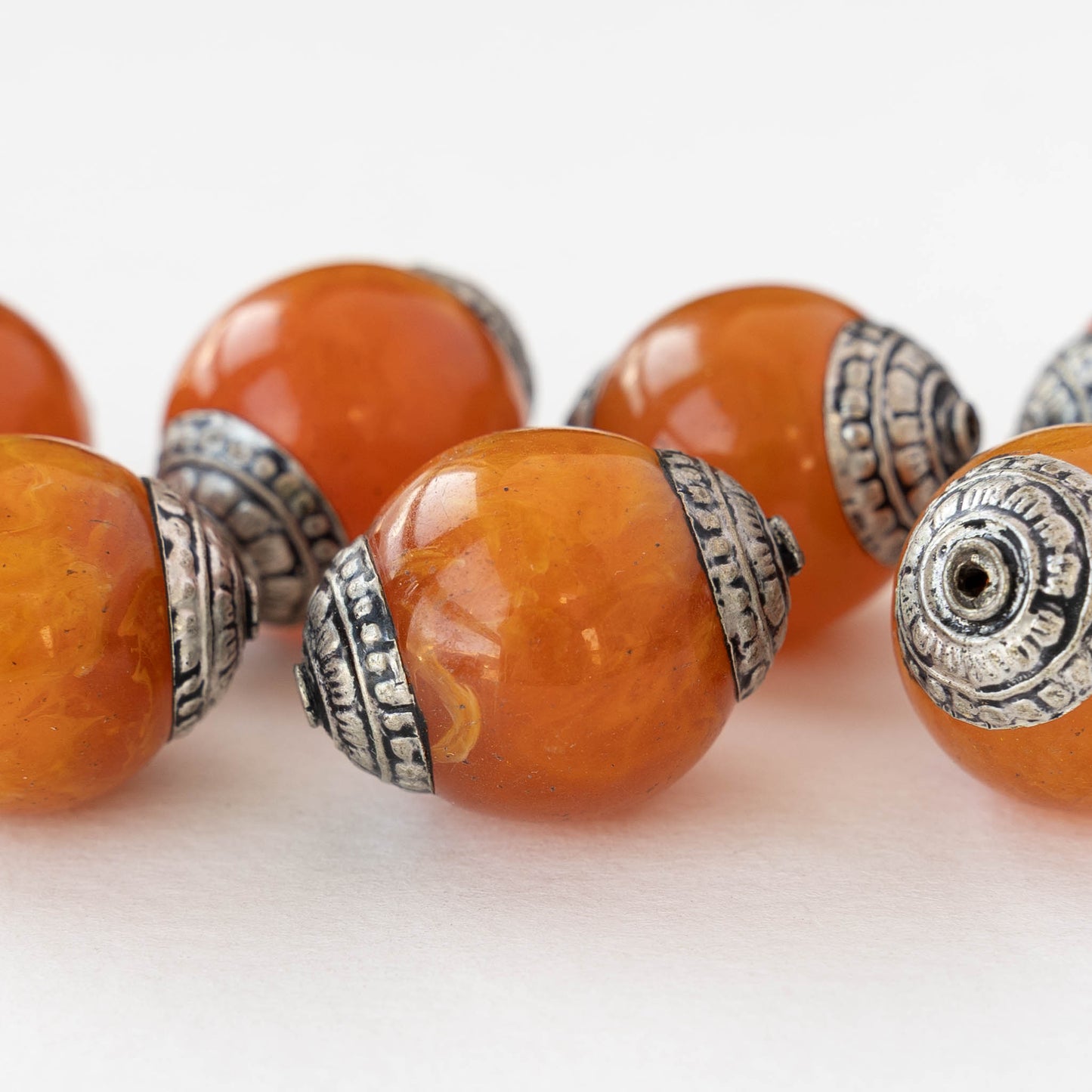 Orange Copal Resin Beads with Tibetan Silver Repoussé Accents