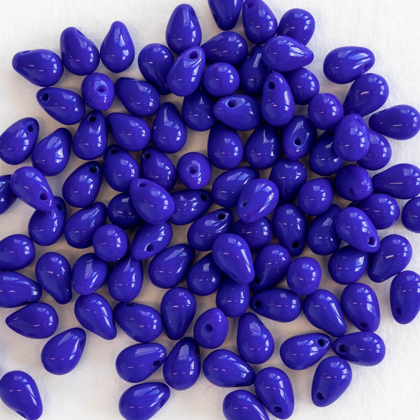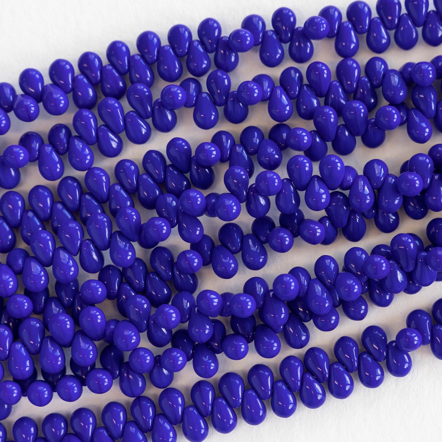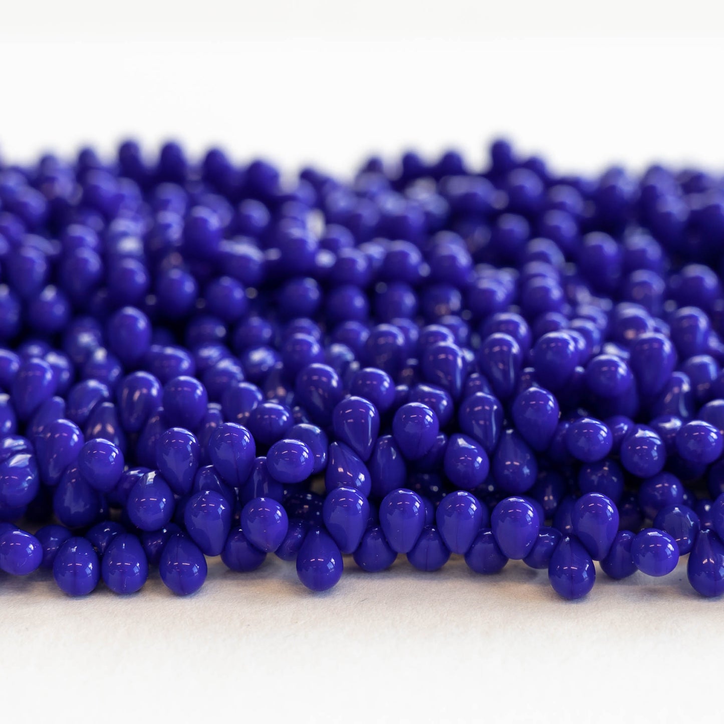 Glass teardrop beads in a beautiful opaque royal blue color. These tiny opaque teardrops are top drilled and have a smooth glossy surface.