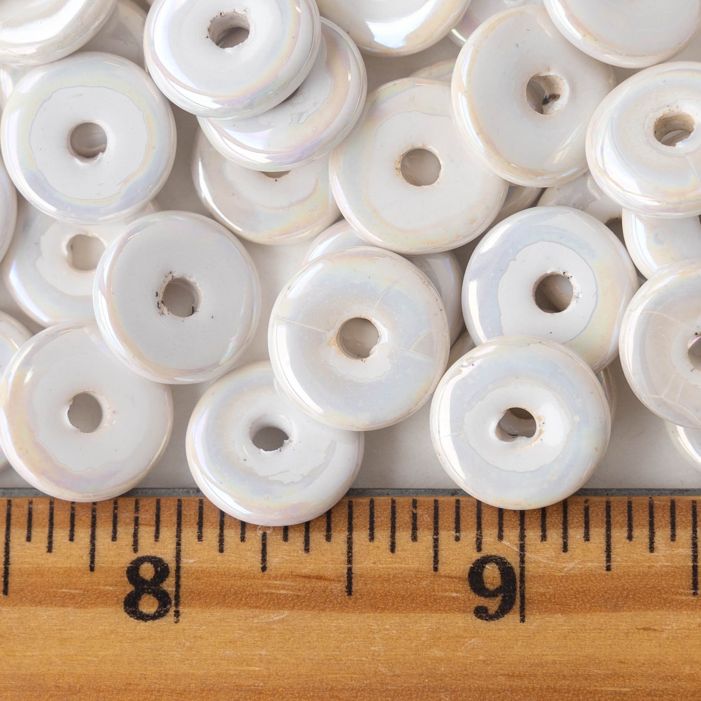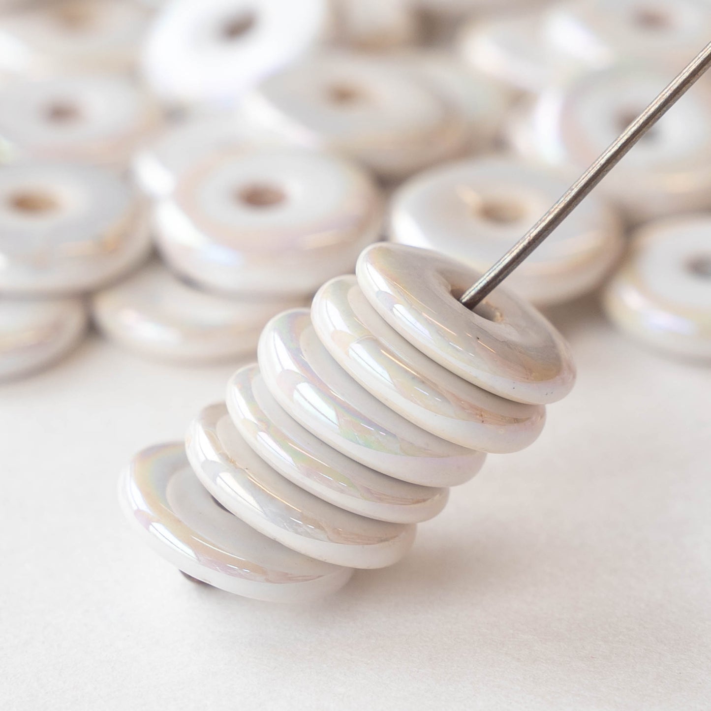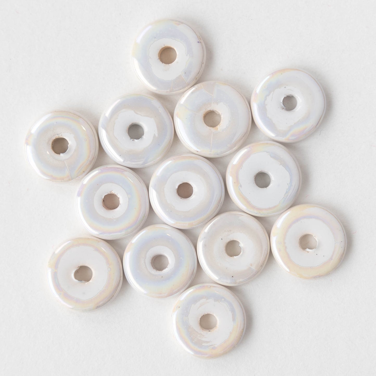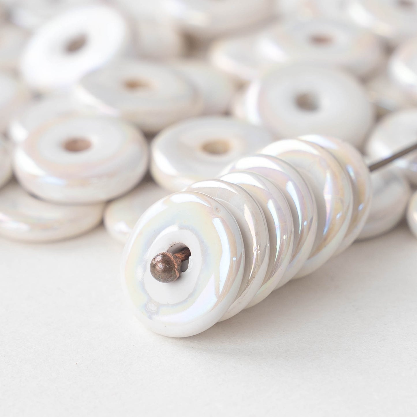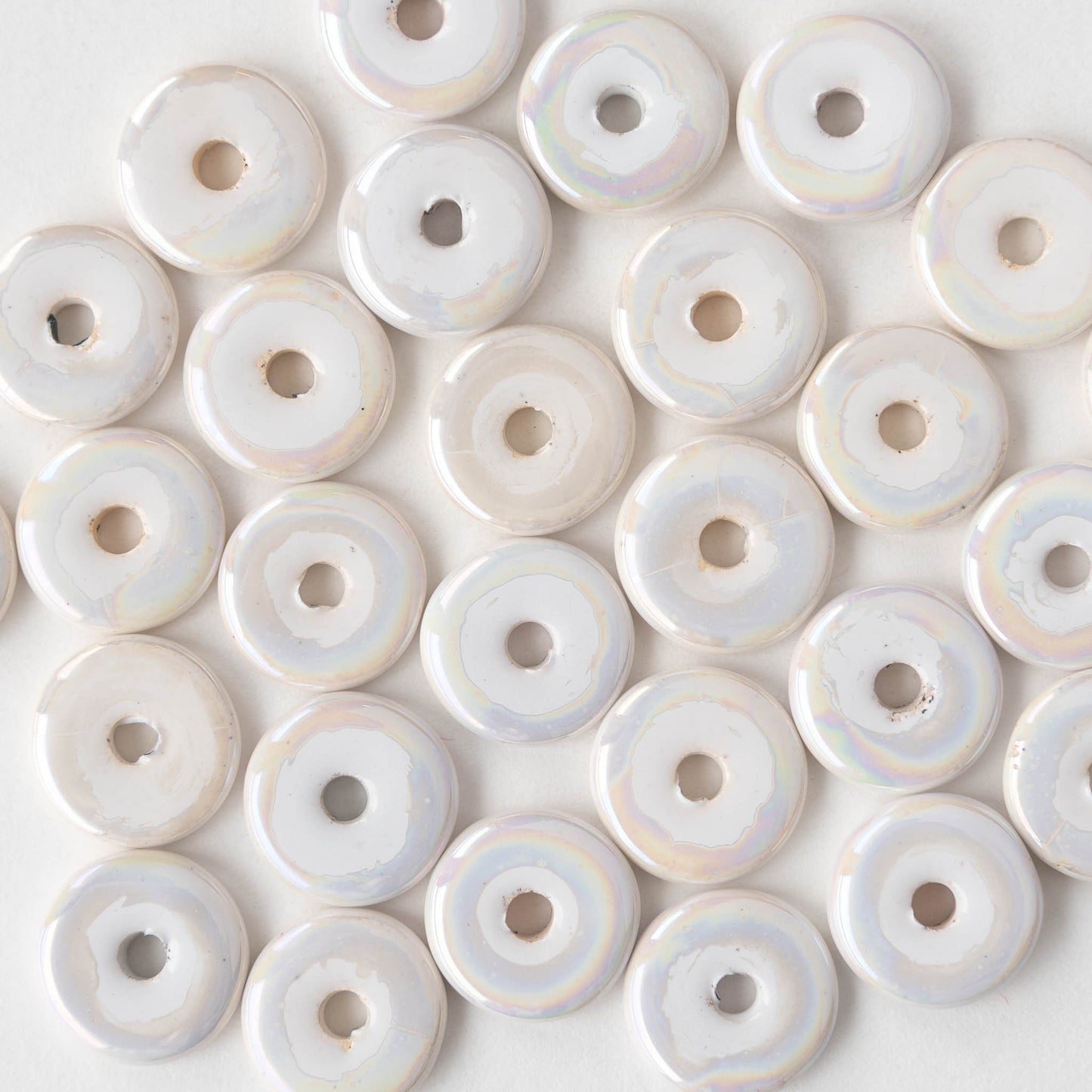 13mm Glazed Ceramic Disk Beads - Iridescent Ivory Opal - 6 or 18 beads