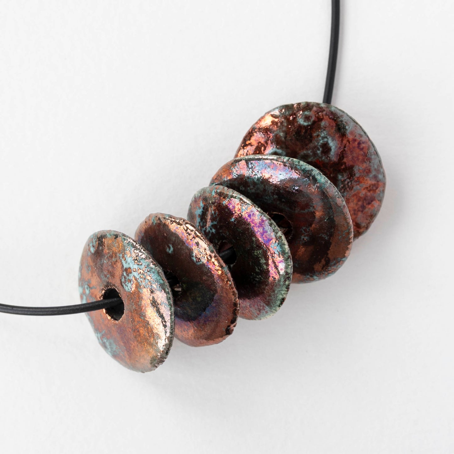 These handmade ceramic beads are fired using the Japanese Raku technique.
