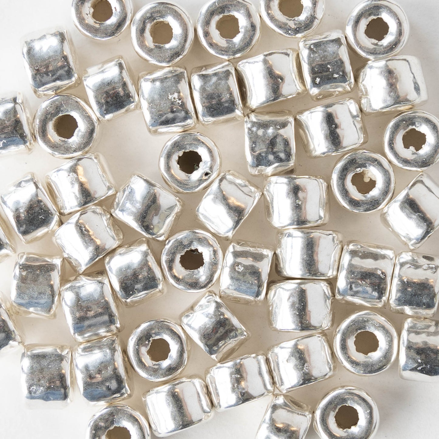 These shiny silver beads are Handmade in made in Greece. They start as kiln-fired terra cotta "biscuits." They are then fired a second time with rough copper, and finished with a coating of fine silver. Very durable. They are lightweight yet sturdy. They don't chip easily at all. I've never seen one break!