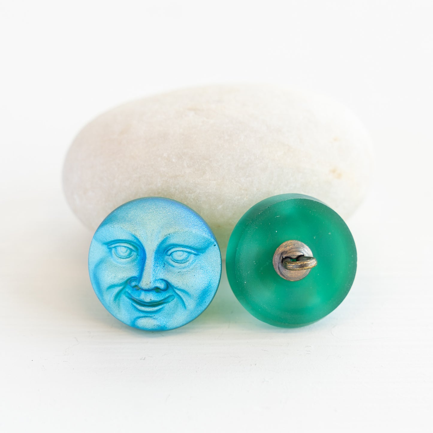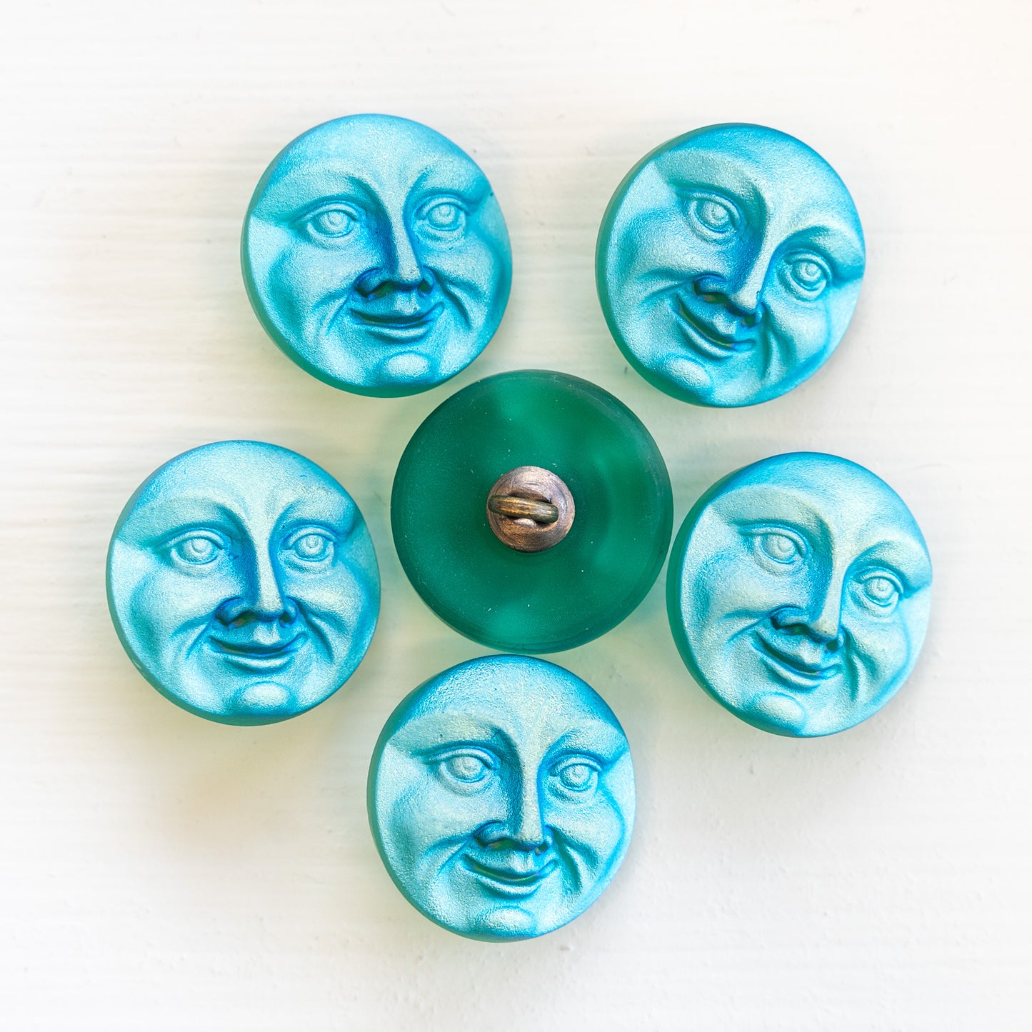 I love these amazing moon face buttons. Super textured matte finish with an etherial Aurora Borealis finish. You can see the attached metal shank in the back of the button.